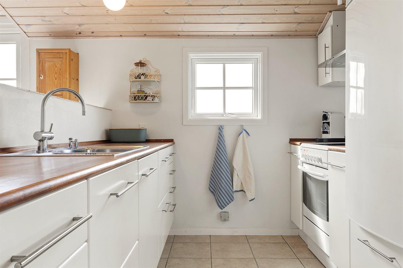 Køkkenet er udstyret med 1 køleskab. Der er 4 keramiske kogeplader, varmluftovn samt opvaskemaskine.