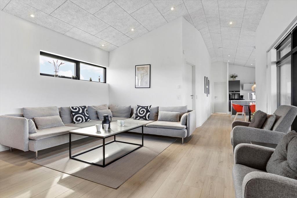 Sommerhusets 119 m2 er blandt andet fordelt på to badeværelser og fire soveværelser, hvoraf sidstnævnte i alt har sengepladser til otte personer. Oveni kommer et lille vaskerum og en stor stue med integreret køkkenafdeling, så kort fortalt er der taget højde for de praktiske forhold og sociale stunder såvel som den gode nattesøvn. Som det kan forventes af et nyt kvalitetsbyggeri præsenterer alle rum sig på lys og lækker vis, og særligt stuen gør sig ekstra bemærket med sit flotte, åbne rumforløb, sin stilfulde indretning og de store vinduer, der inviterer masser af dagslys indenfor.
