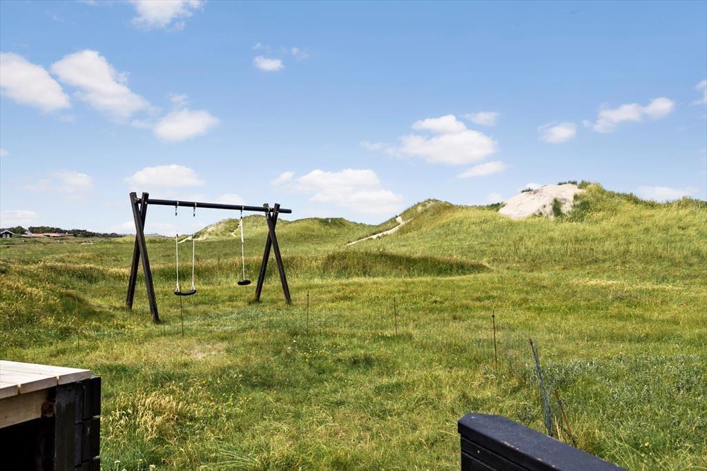 Den store naturgrund smelter på smukkeste vis sammen med det omkringliggende landskab, så I har virkelig fornemmelsen af at bo i klitterne. I forlængelse af terrassen er en mindre del af grunden skærmet af trådnet, hvilket hundeejerne måske især vil sætte pris på, mens børnefamilier kan glæde sig over gyngestativet. Den vestvendte og delvist overdækkede terrasse er helt lukket, og på den anden side af huset finder I endnu en skøn terrasse, der også har et åbent areal såvel som en overdækket lækrog.