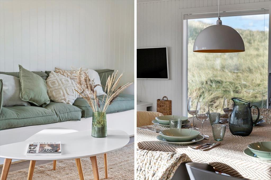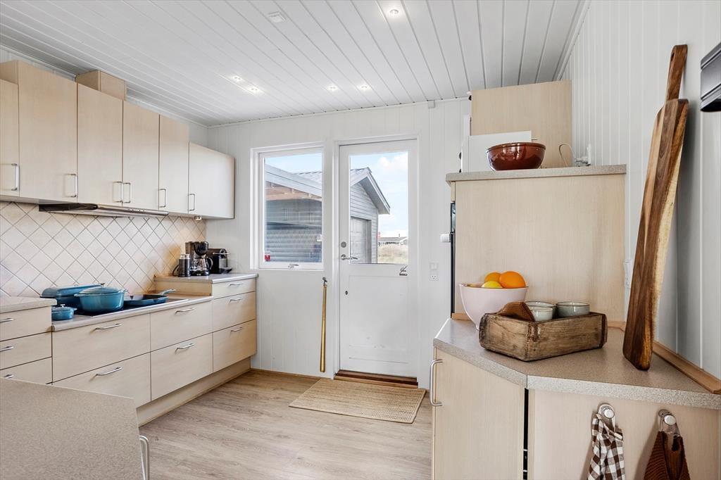 Efter en vellykket renovering i 2022 har sommerhuset et lyst og indbydende indre. Vægge og lofter er malet hvide, og de store stuevinduer inviterer masser af dagslys indenfor og giver udsigt til de marehalmsklædte klitter. For eksempel er det skønt at slå sig ned med en god kop kaffe i den hyggelige sofakrog, der er etableret ved den vestvendte glaskarnap, og der er også mulighed for at rykke sig tættere på enten brændeovnen eller fladskærms-tv’et, hvis en af delene lokker. Fra stuen har I åben forbindelse til et stort og veludstyret køkken, og planløsningen byder derudover på tre gode soveværelser og et rummeligt badeværelse med badekar og vaskesøjle.