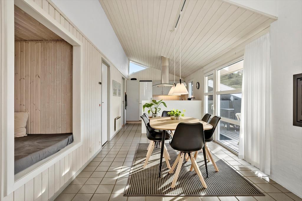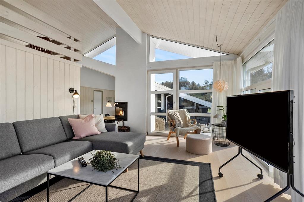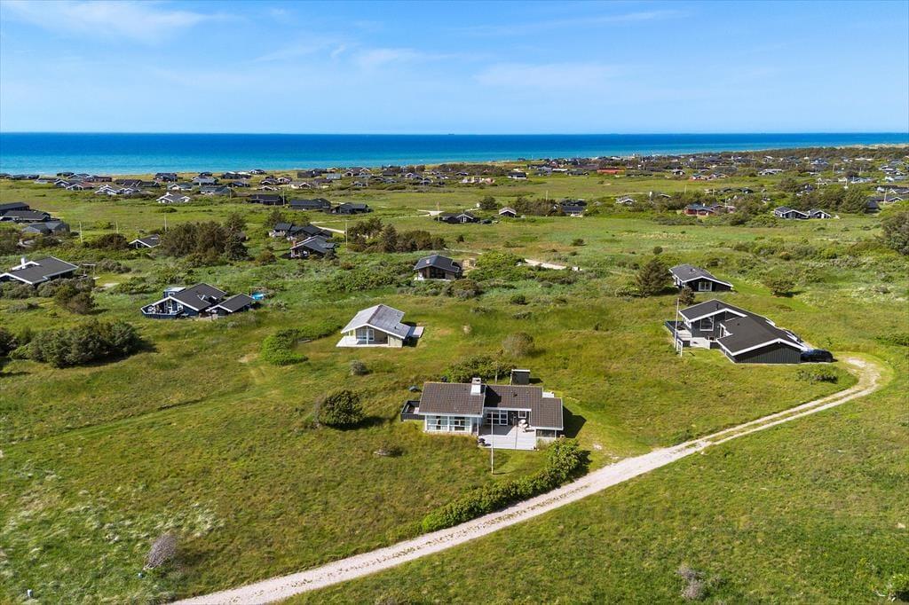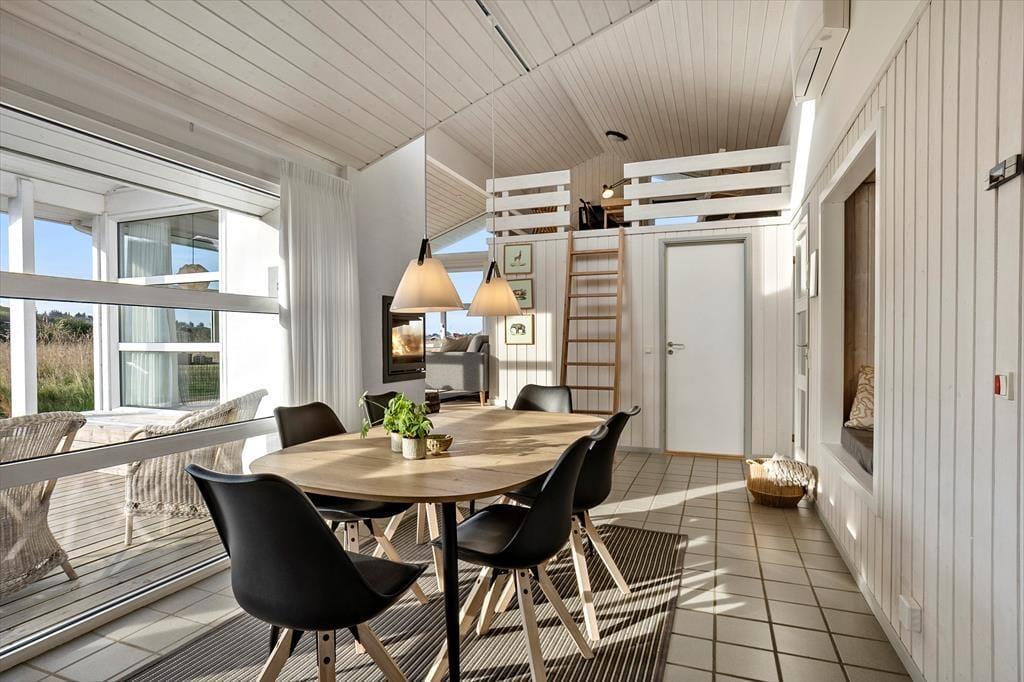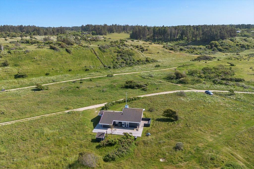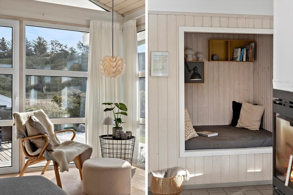 Selvom der er meget at se og opleve i lokalområdet, er det fristende bare at blive hjemme i sommerhuset, for det er nemlig et utroligt dejligt eksemplar med en rar atmosfære og en glimrende planløsning til seks personer. Foruden tre soveværelser er der et gæstetoilet og et badeværelse inden døre, og sidstnævnte er udstyret med et hjørnespabad, så I kan forkæle jer selv med wellness og total afslapning. I stuen, der ligger et par trin hævet i forhold til køkken-alrummet, er der stort fladskærms-tv med Chromecast, og indbygningspejsen er smart placeret, så I kan se flammerne fra sofaafdelingen såvel som fra spisebordet. Gennem de store vinduer har I udsigt til indlandsklitterne, både når I står i det åbne køkken og slapper af i stuens sofaafdeling, og selv fra hemsen har I kig til det smukke landskab.