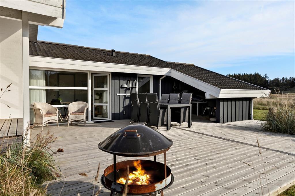 Når solen lokker jer ud i det fri, har I flere skønne opholdspladser at vælge imellem, for der er nemlig store træterrasser på begge sider af huset. I har selvfølgelig havemøbler og liggestole til rådighed, og der er både kul- og gasgrill, hvis I vil udfolde jeres kulinariske evner i det fri. I hvert fald kan de frisktilberedte lækkerier ikke smage meget bedre, end når de indtages her i den salte havluft og med udsigt til den bakkede natur.