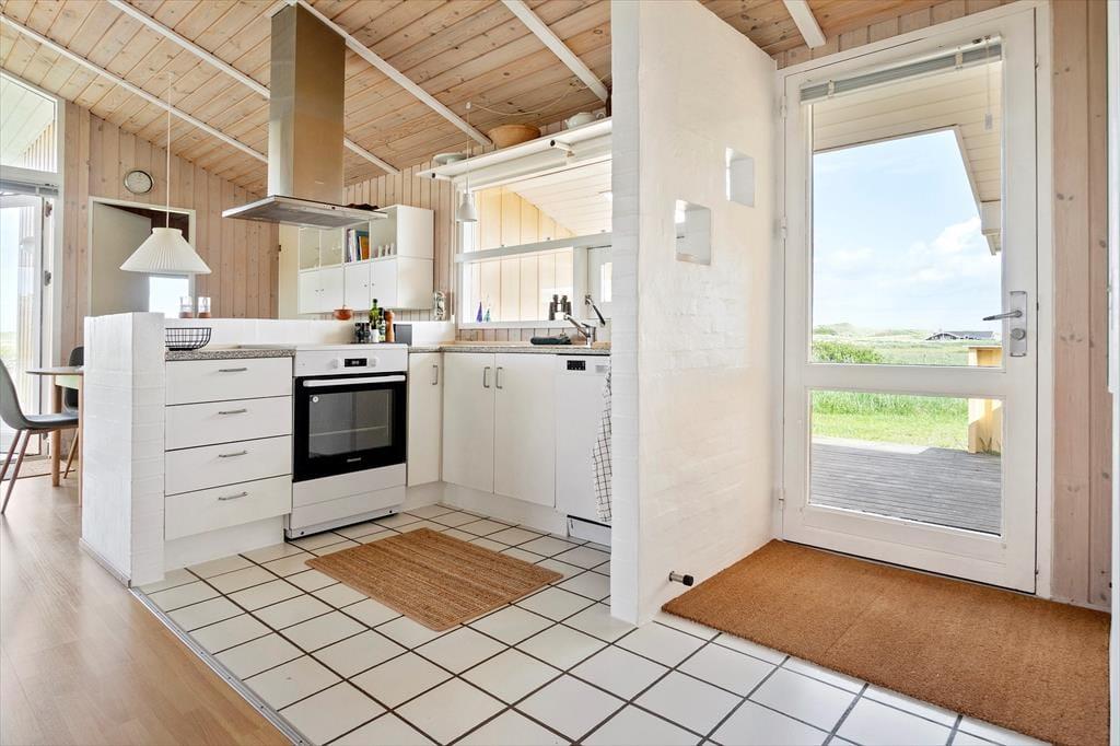 Når du træder indenfor, kan du straks føle dig hjemme i de kønne og stemningsfulde rum. Den åbne forbindelse mellem stue og køkken sørger for, at du og dine kære har god plads til at være sammen, uanset om I hygger jer med madlavningen eller sidder med brætspil og gode bøger nær den knitrende brændeovn. I løbet af dagen inviteres solen ind i opholdsrummet fra tre verdenshjørner, og vinduerne giver udsigt til de naturskønne omgivelser. Også fra et af de tre soveværelser kan du se lige ud på Nørlev Strands klitrække, når du slår øjnene op om morgenen.