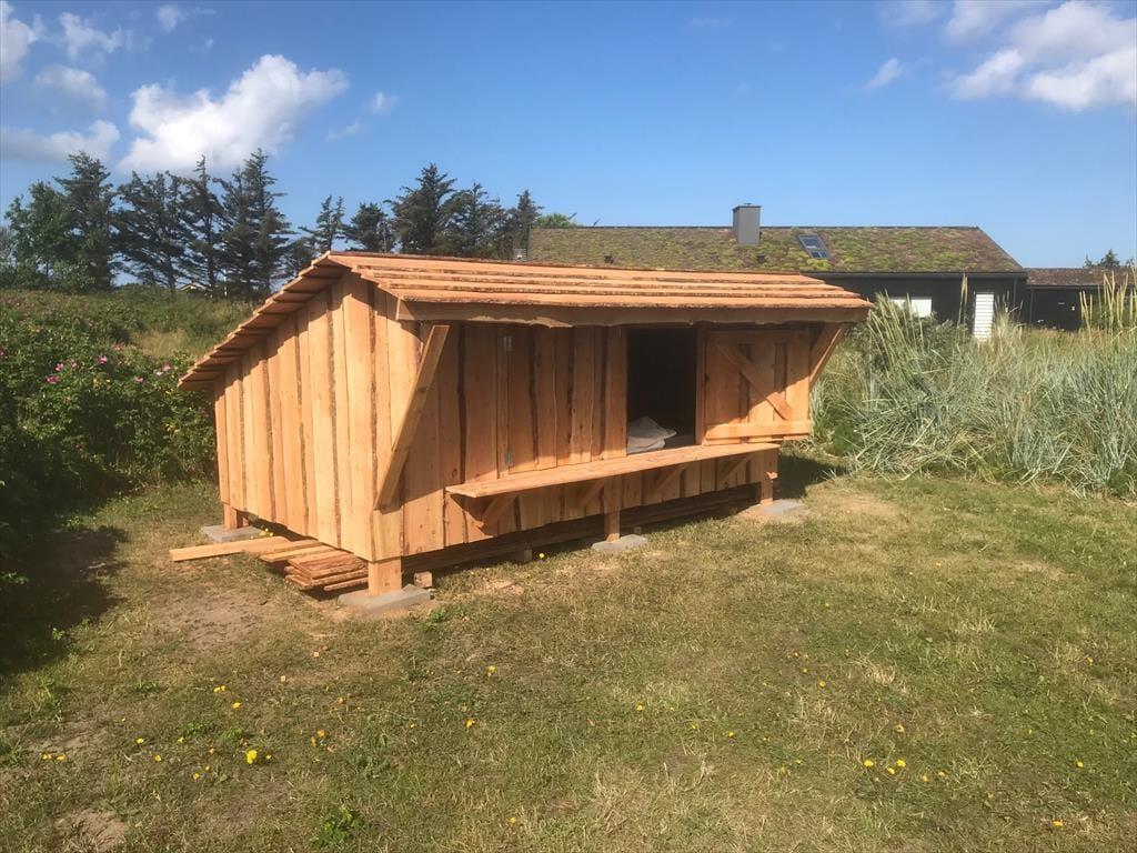 På den enkelt anlagte plænegrund har I god plads til at lege og spile bold, for I har hele 1388 m2 at gøre godt med. En del af kvadratmeterne er dedikeret til en stor og delvist overdækket terrasse, der smyger sig om tre af husets sider. Om sommeren kan I bare lade havedørene stå åbne, så I har fri passage mellem stuen og terrassen – det er skønt lige at kunne smutte ind for at hente en kølig drink eller et stykke vandmelon, når man har siddet i solen. Vil I allerhelst blive ude, er der ligefrem mulighed for at sove i det fri, for i 2022 er der opført et shelter til fire personer på grunden.
