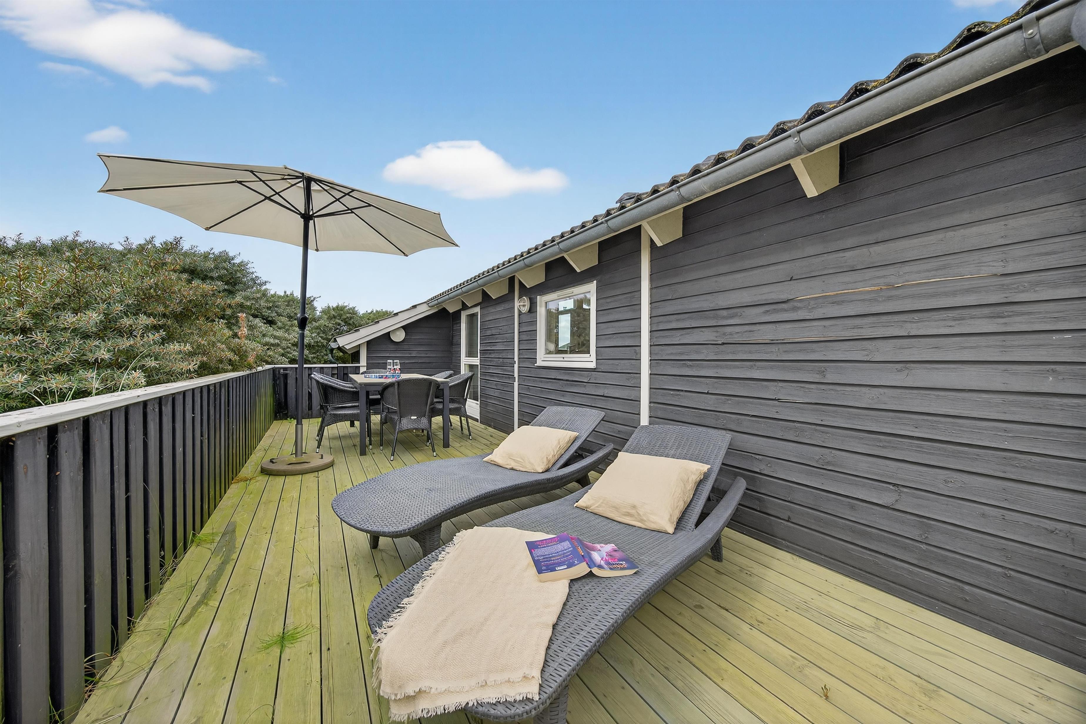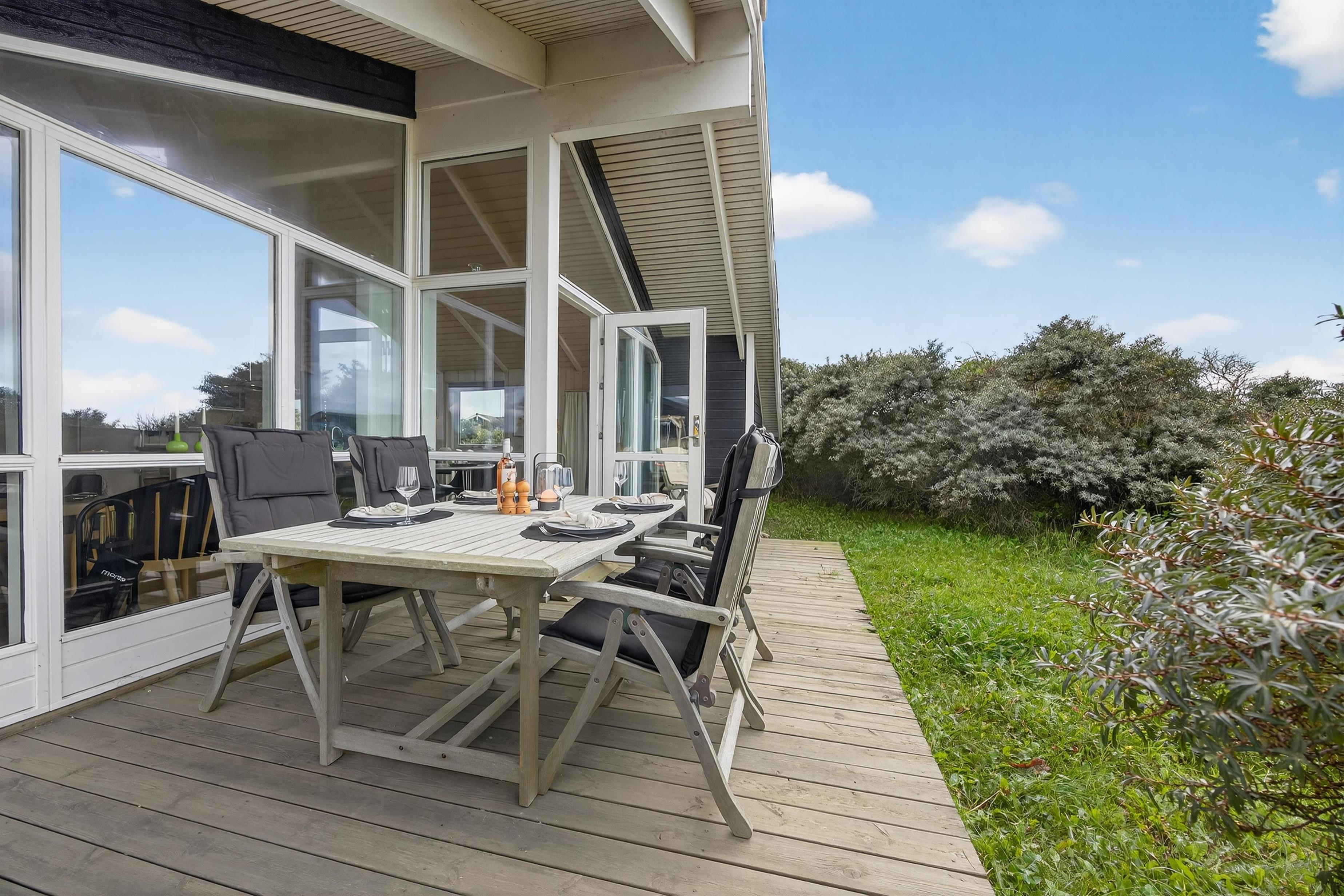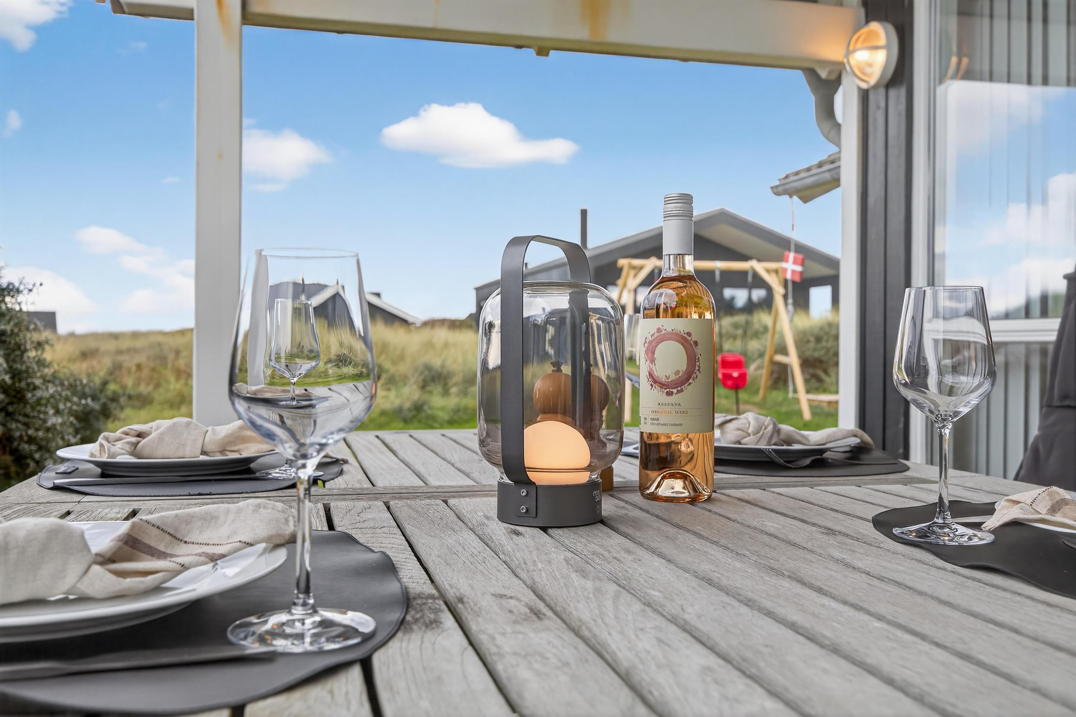 Feriehuset ligger på en ugeneret og uspoleret naturgrund, hvor man virkelig kan mærke naturens nærvær. Fra det lyse opholdsrum er der direkte adgang til en hyggelig, overdækket terrasse, hvor du kan nyde sommeraftener med solnedgangen i baggrunden, omgivet af marehalm og havtorn.