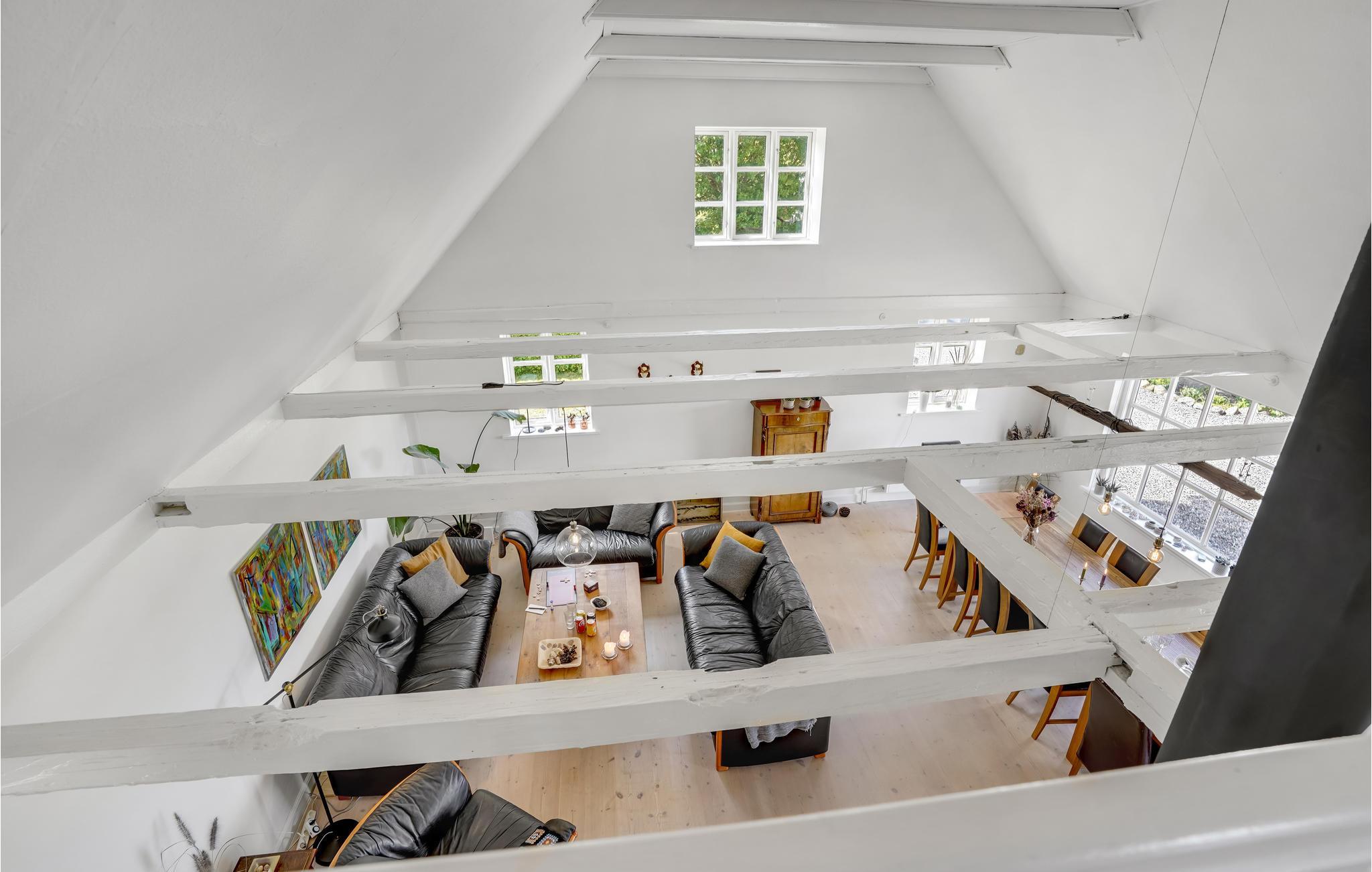 På den fynske nordkyst byder dette tidligere husmandssted jer velkommen med masser af plads og indbydende rum. Med sine bjælker og med loft til kip udstråler dette hus midt i det grønne landskab en særlig charme. Her kommer I ikke til at kede jer. Brug det store aktivitetsrum til spil, sjov og underholdning. Bordtennis, bordfodbold, billard og mange andre spil står til jeres rådighed. Men også stuen og de andre værelser, som er fordelt på to niveauer, indbyder til hyggelige stunder og masser af sjov. Husets to længer danner den perfekte ramme om den store terrasse, der tilbyder det ideelle sted til solskinsmorgener og grillaftener. En anden terrasse er let forhøjet og imponerer med en smuk udsigt over landskabet og vandet. Dans en sommerdans i haven og forsøg at slå vejrmøller.