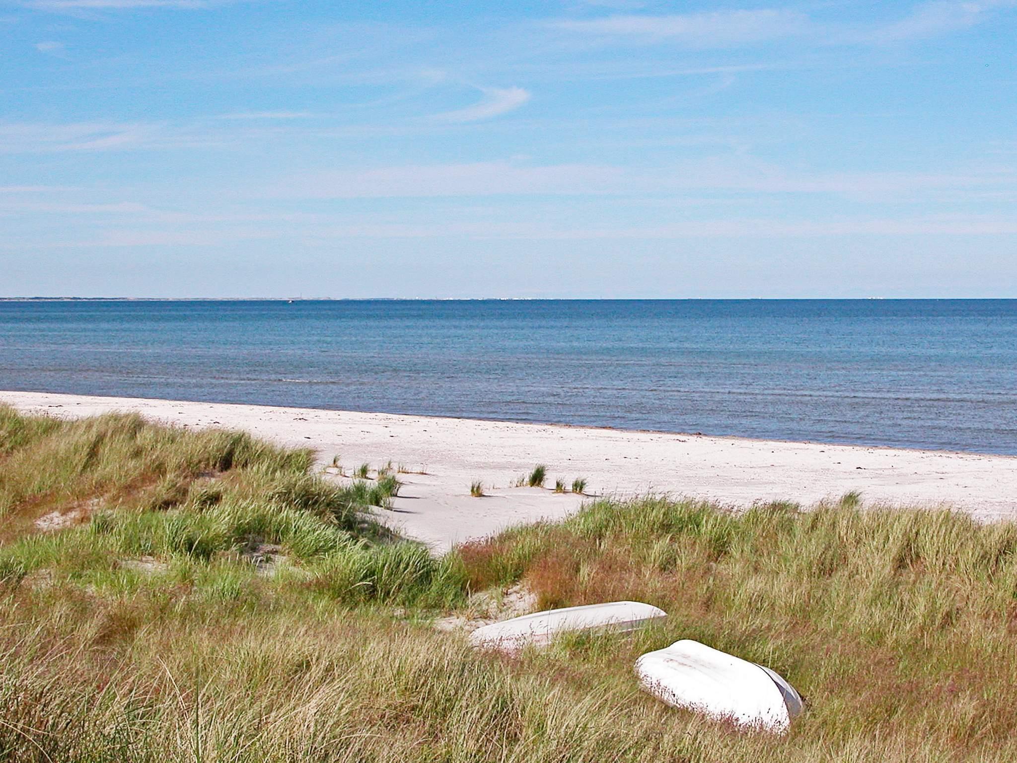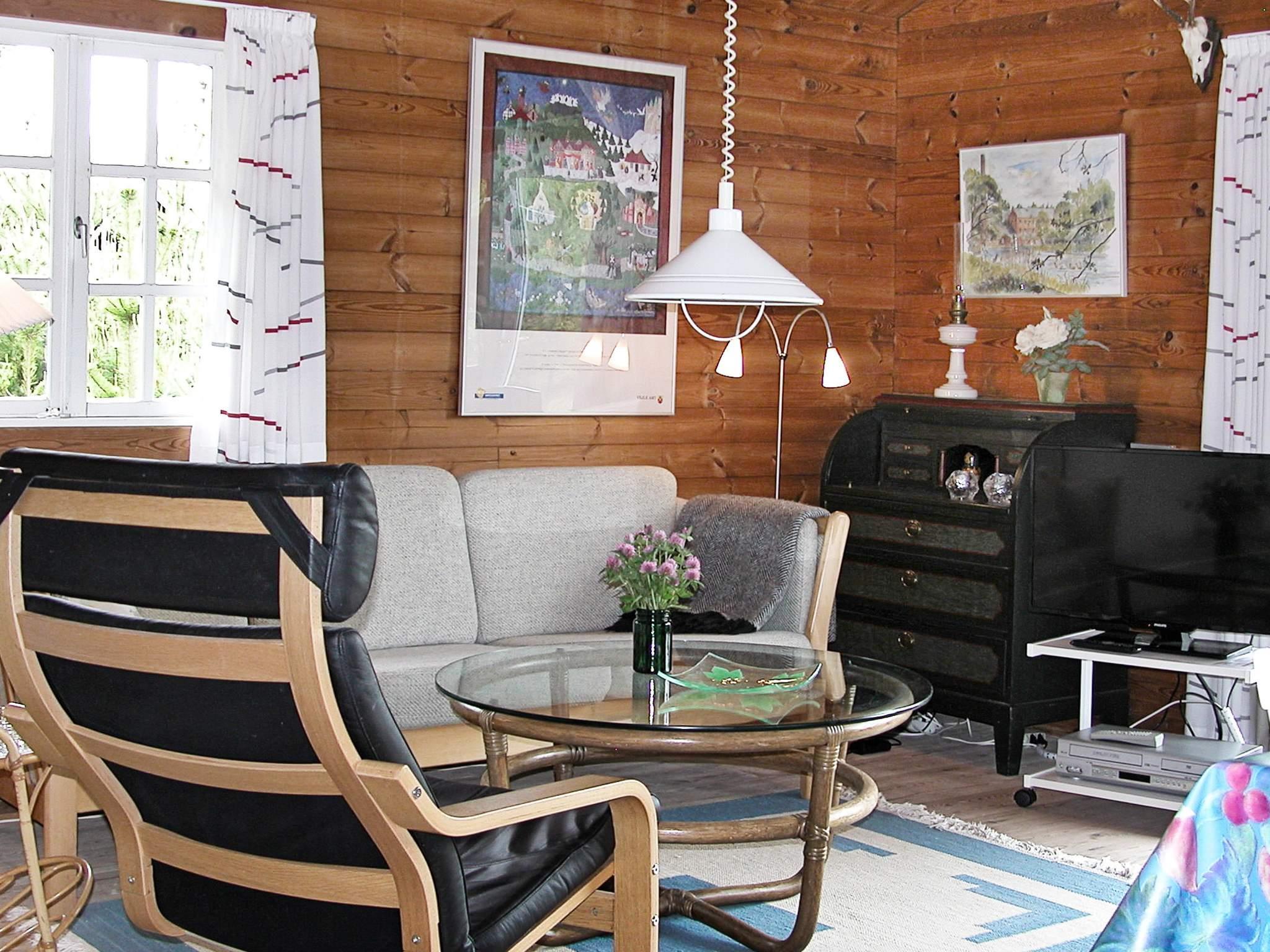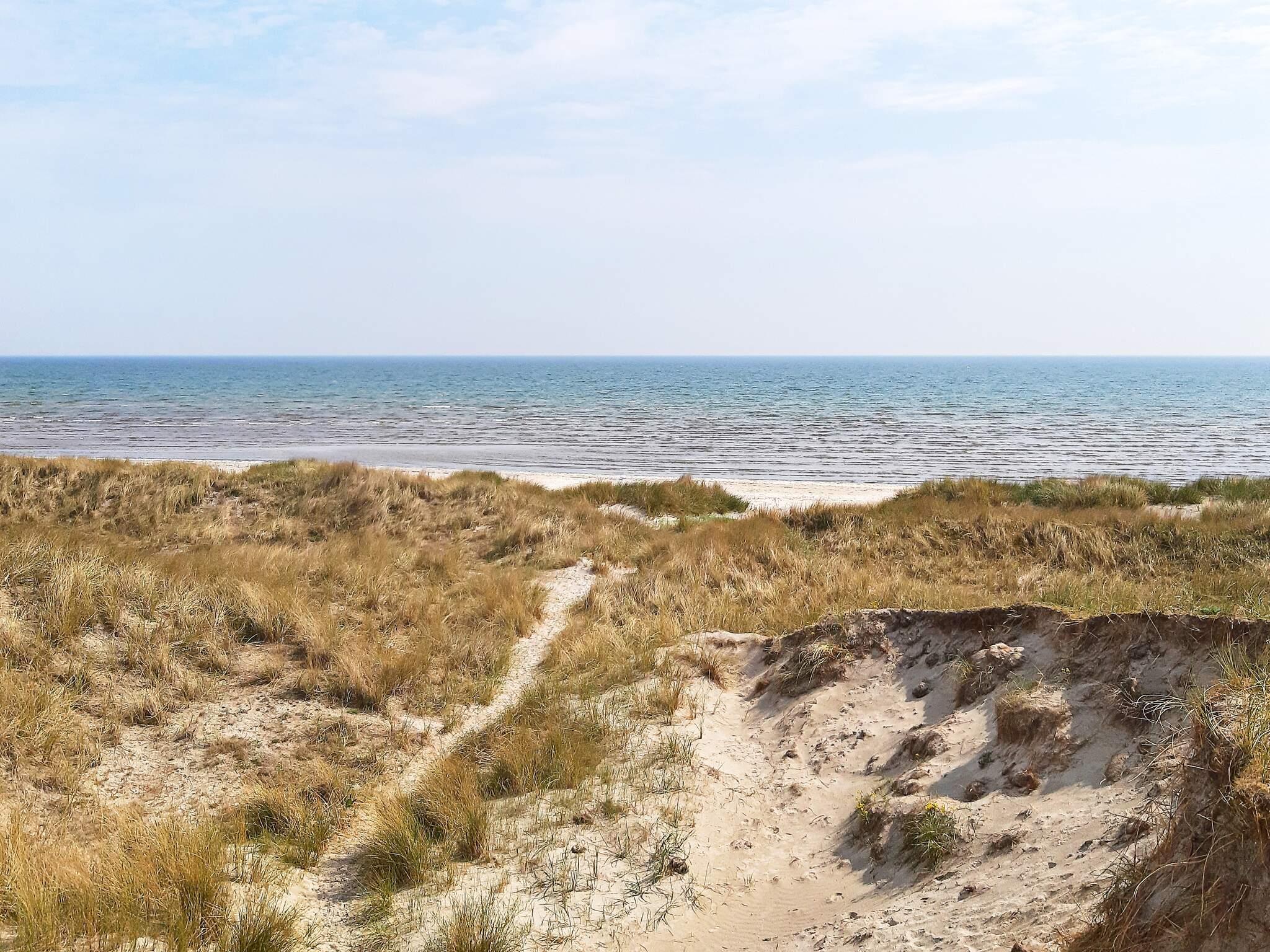 Vinkelbjælkehus med stor opholdsstue, hvorfra der er direkte udgang til overdækket terrasse. Depot med tørretumbler og ekstra køleskab med fryser. Huset ligger på ugeneret grund med bevoksning og tæt ved børnevenlig strand.