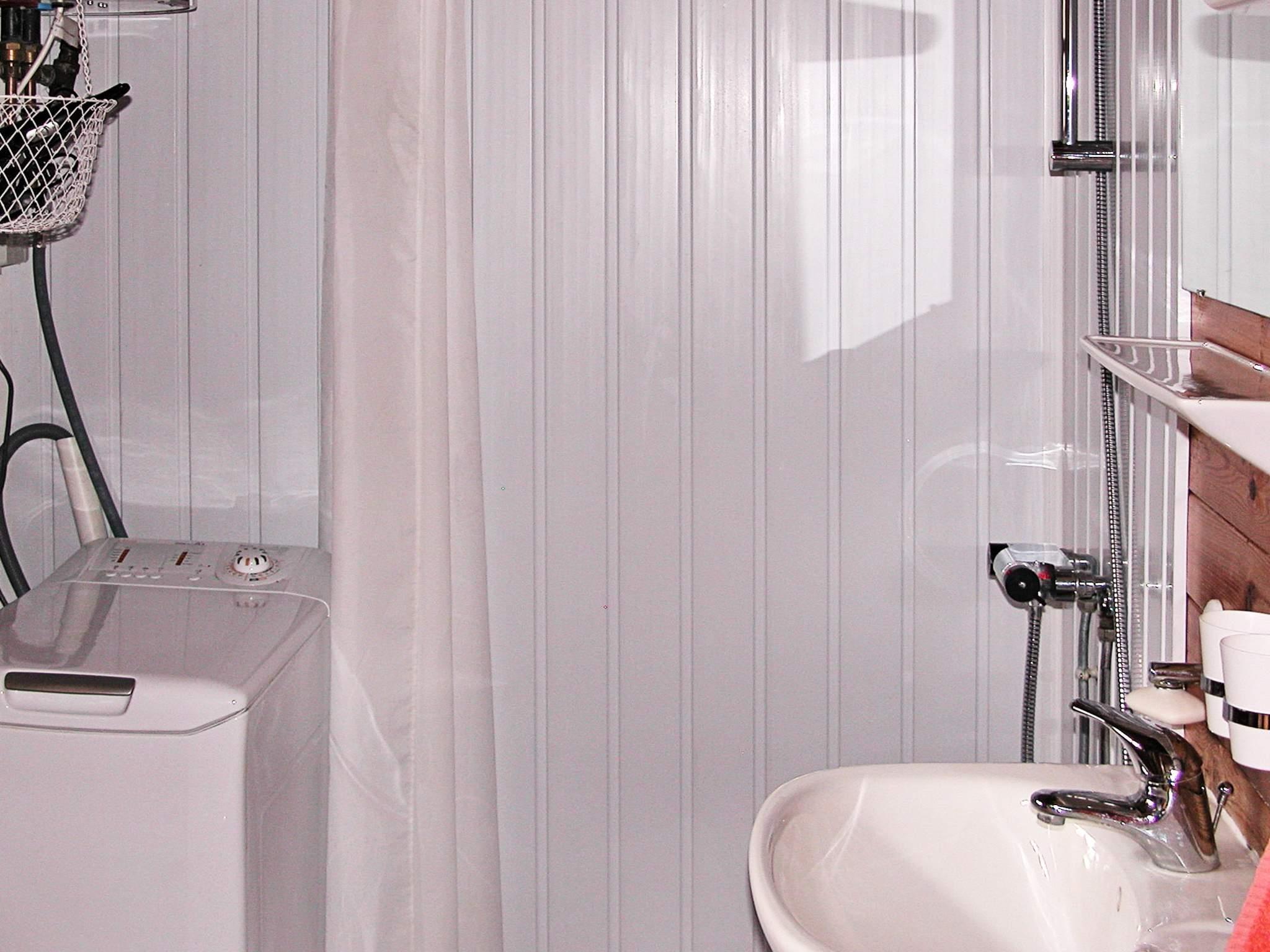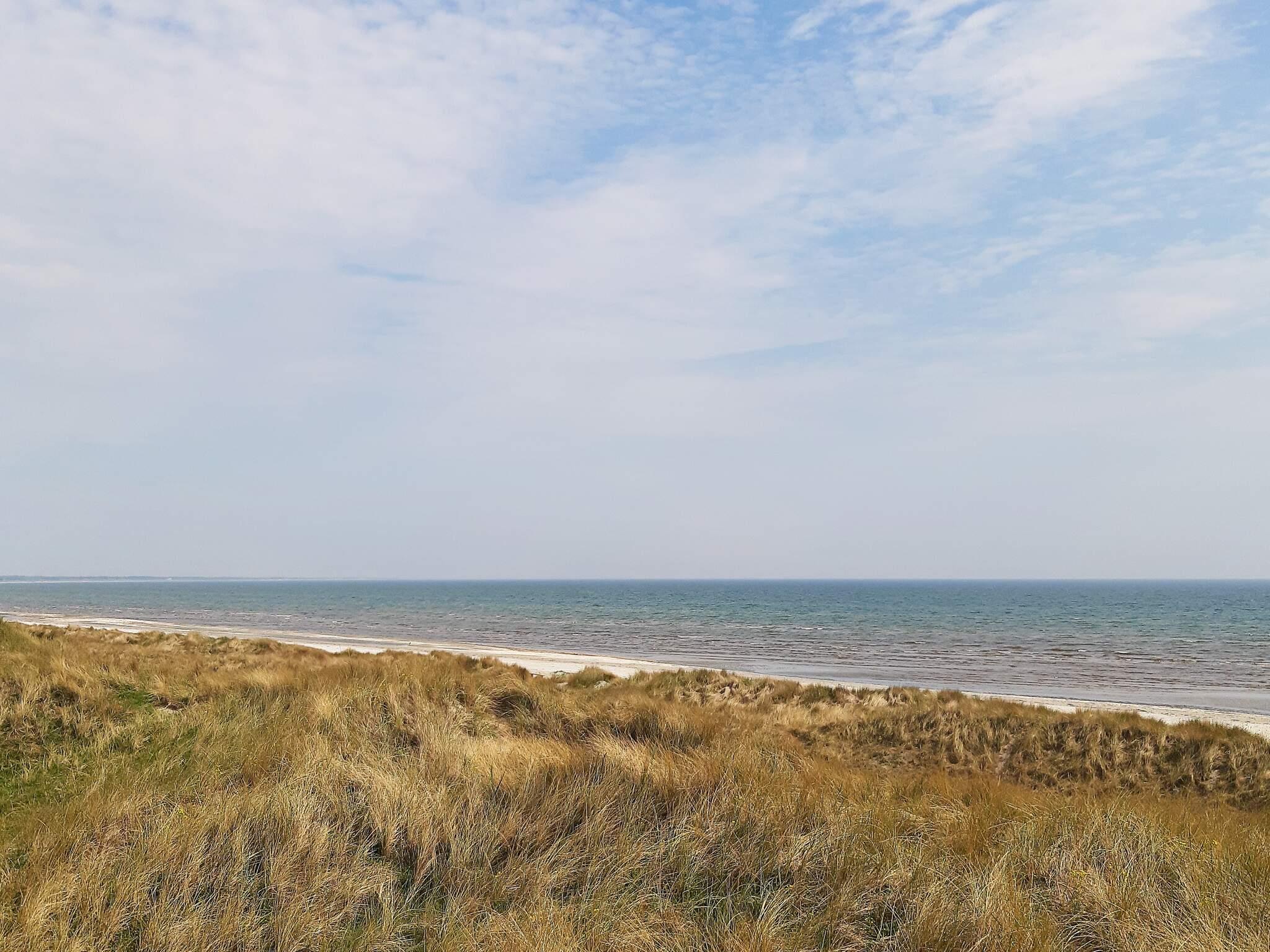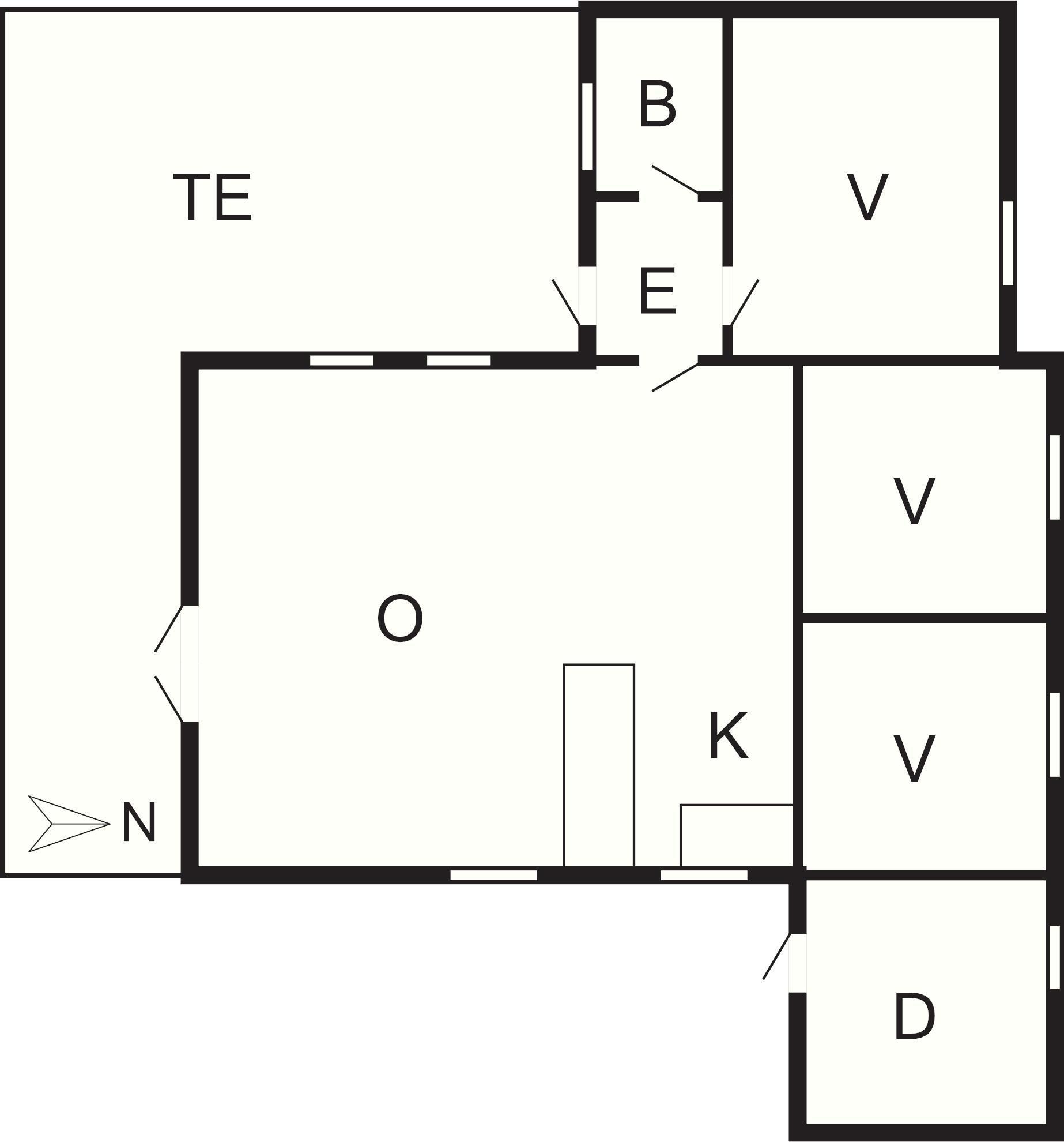Vinkelbjælkehus med stor opholdsstue, hvorfra der er direkte udgang til overdækket terrasse. Depot med tørretumbler og ekstra køleskab med fryser. Huset ligger på ugeneret grund med bevoksning og tæt ved børnevenlig strand.