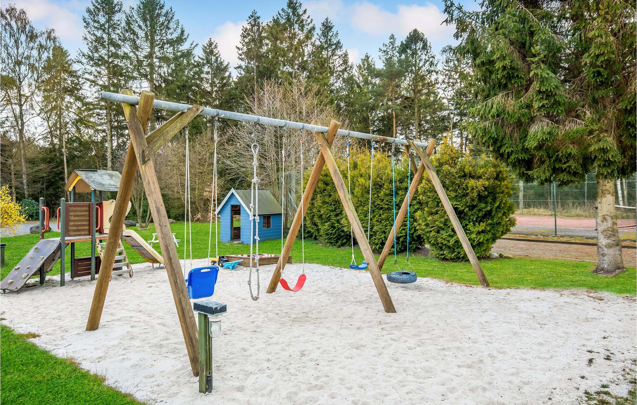 Dueodde Feriepark er grøn og omkranset af skov, så I kommer til at bo i en naturskøn, lille oase, hvor I kan slappe af mellem jeres oplevelser i området. I kommer ikke til at kede jer, for der er også en lang række aktiviteter at vælge mellem. Alt afhængig af vejret kan I begynde dagen med en dukkert i indendørs- eller udendørspoolen. Det kan også være, at I foretrækker et besøg i fitnesslokalet, og senere får I måske lyst til at tage en dyst over et spil bordtennis, tennis eller petanque. Børnene har adgang til en legeplads, og efter en frisk dukkert kan I få varmen i saunaen.