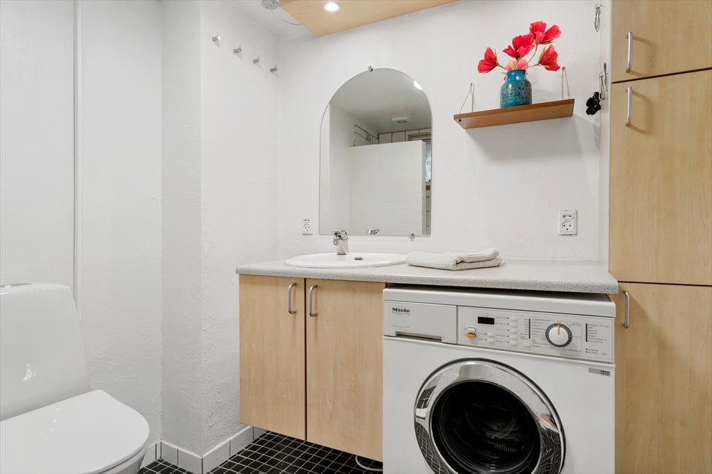 Centralt i stueetagen er også husets badeværelse, der har en fin størrelse og med en god brusekabine.