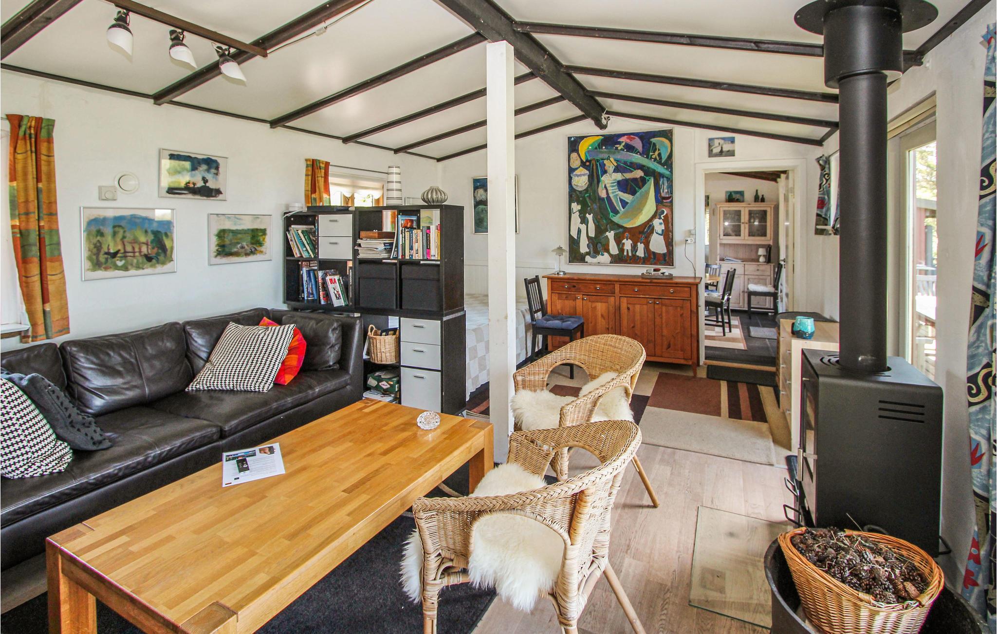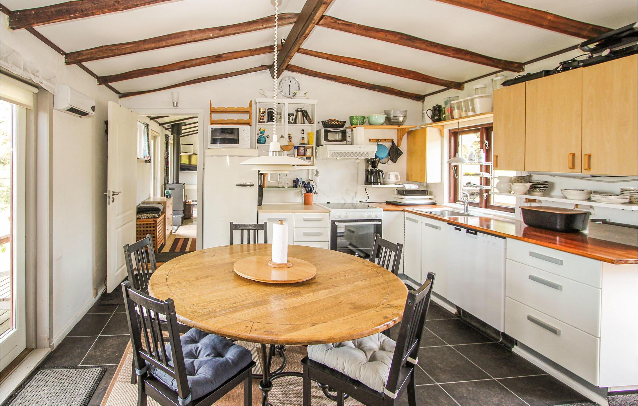 Huset indeholder et veludstyret køkken til alle former for madlavning, og udenfor kan der grilles. Køkkenet har spisebord med god plads og direkte udgang til terrasser mod både øst og vest, så det også er let at tilberede og nyde maden udendørs. I stuen er der brændeovn og panoramaudsigt over Kattegat, hvor man kan nyde solnedgangen og være heldig at spotte en flok marsvin til vands eller rådyr i bakkerne.