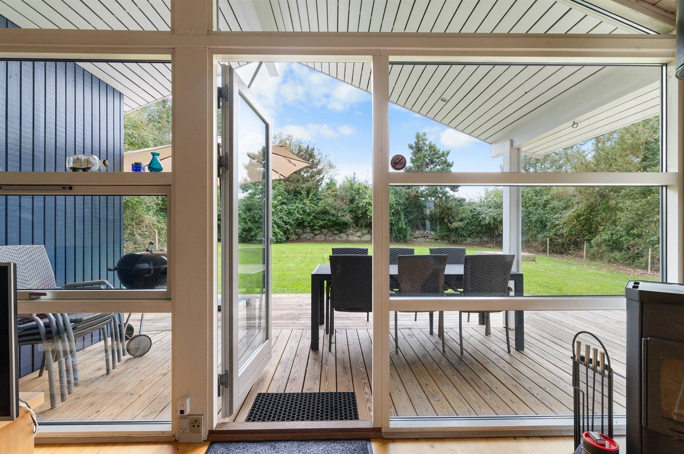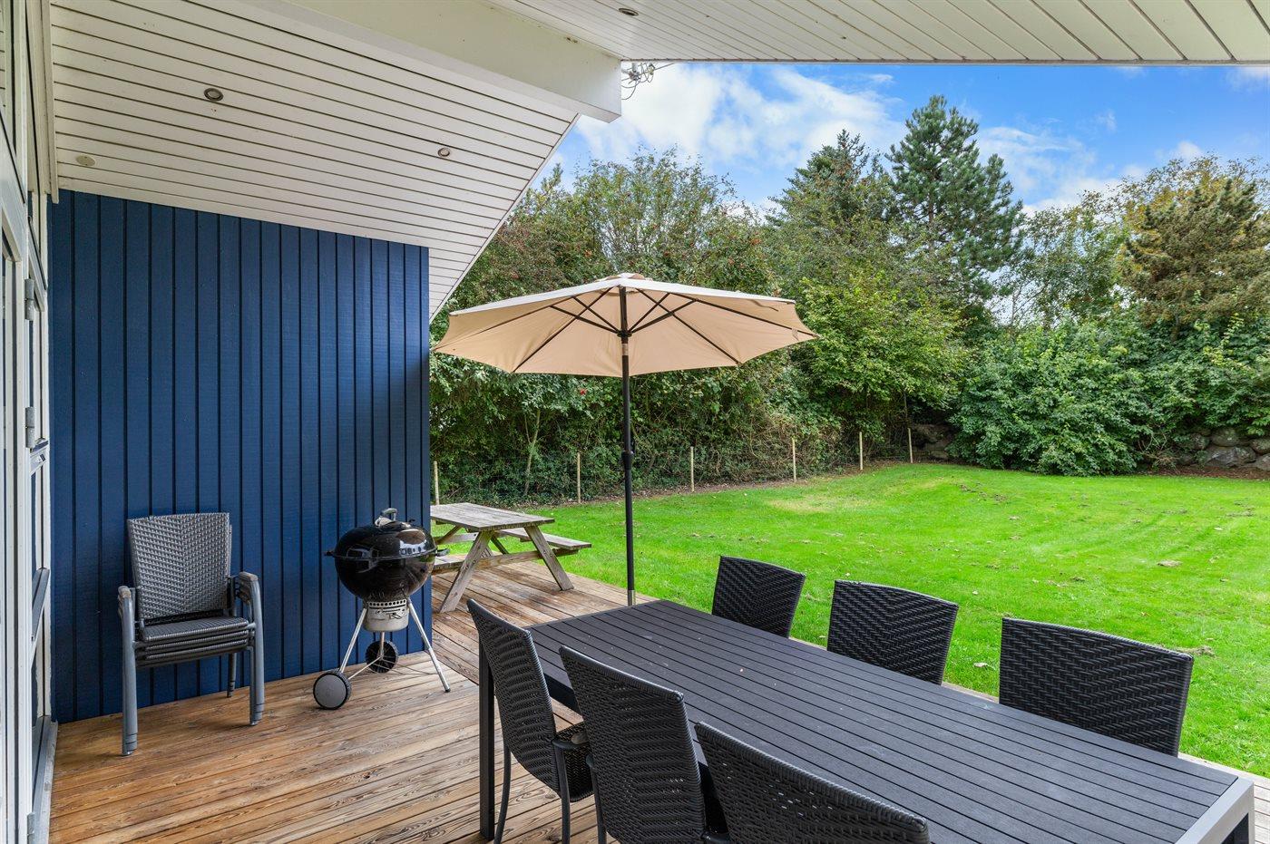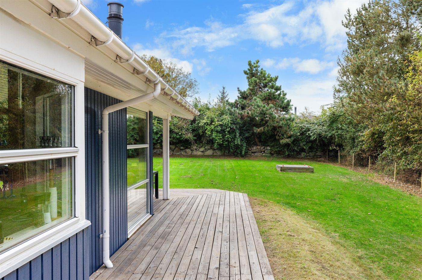 Til huset hører et dejligt, sydvendt terrasseareal, som er delvist overdækket. I den indhegnede have er der god plads til udendørs aktiviteter. Bemærk at hegnet er 90cm højt.