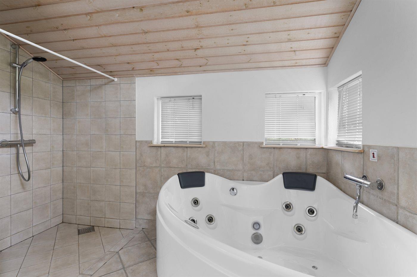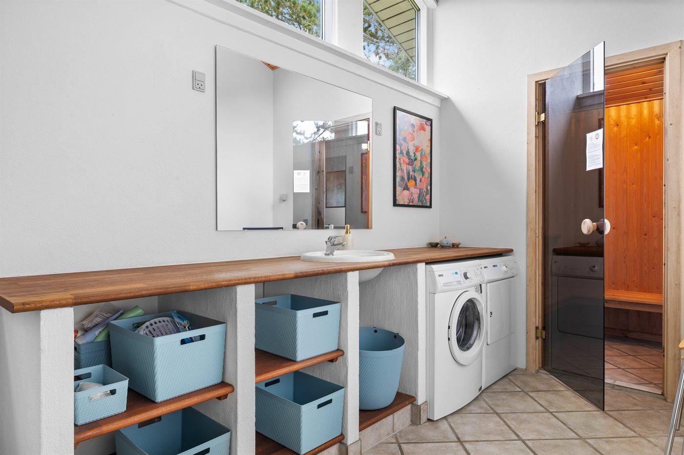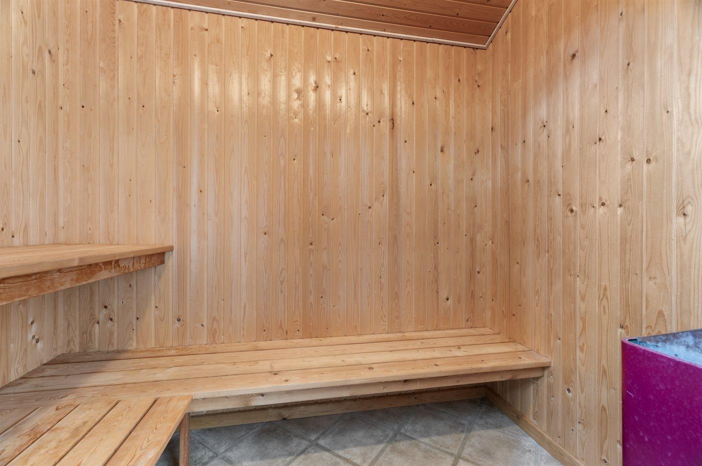 Der er 1 badeværelse med gulvvarme og bruseniche samt et separat rum med gulvvarme og toilet. I saunaen er der mulighed for afslapning.