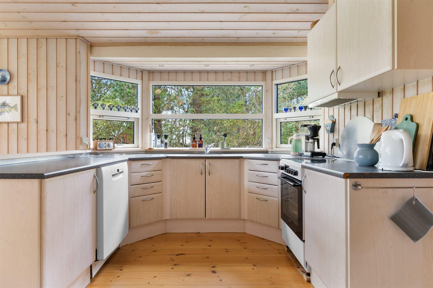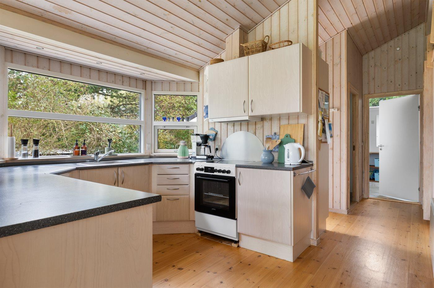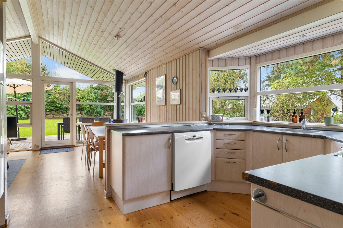 Køkkenet er udstyret med 1 køleskab. Der er 4 induktionskogeplader, varmluftovn, mikrobølgeovn samt opvaskemaskine.