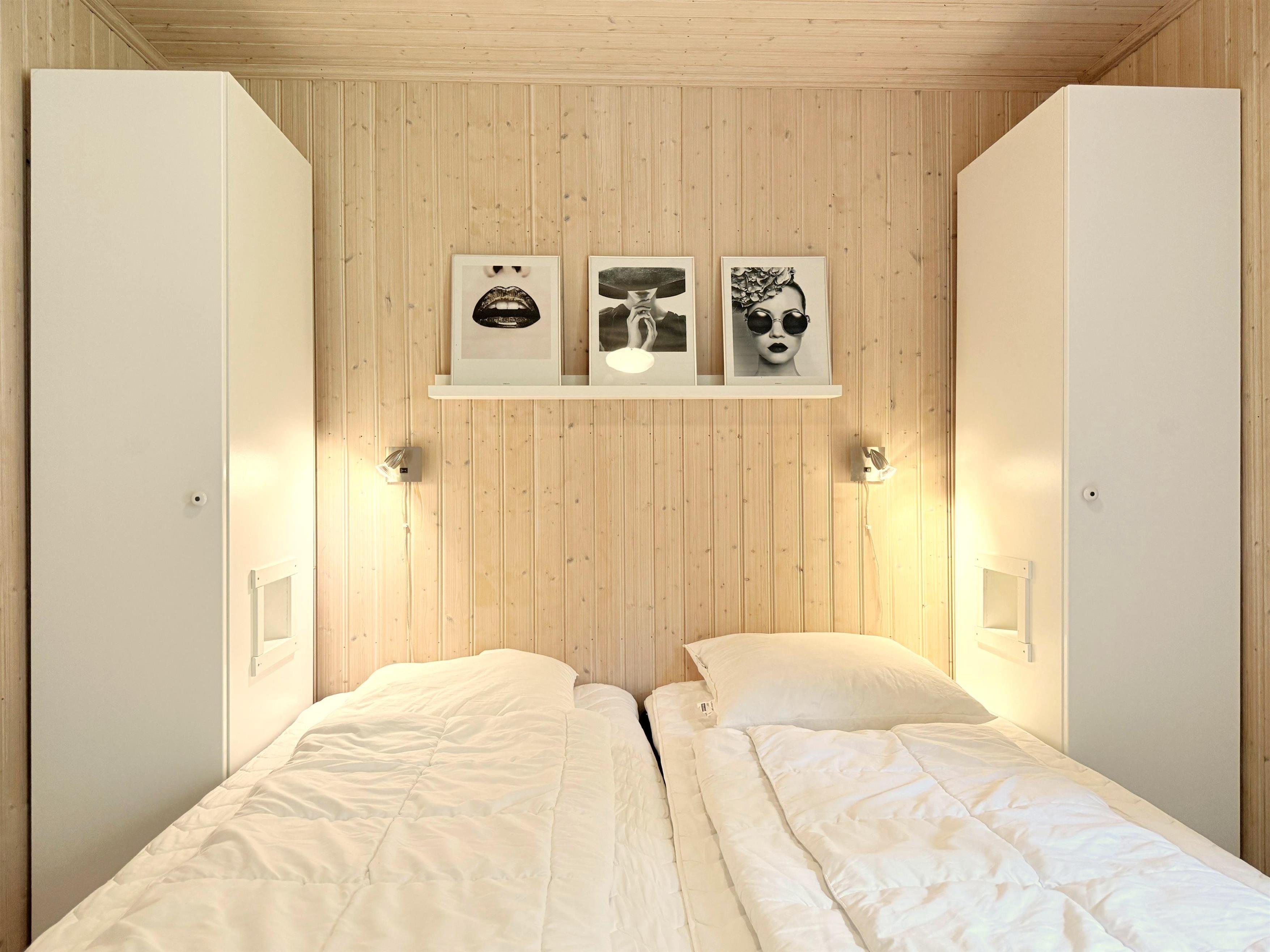 Huset har et dejligt stort fællesrum med et fint og veludstyret køkken, hvorfra der er udgang til overdækket træterrasse. I sammenhæng med køkkenet er der spiseplads og en hyggelig stue med brændeovn, behagelige møbler og smagfuld indretning. Der er tre soverum, henholdsvis to med dobbeltseng samt et med enkel/ køjeseng. Det ene soveværelse har desuden udgang til den overdækkede træterrasse. Rummeligt, flot badeværelse med marmorklinker, gulvvarme, brus og spa. Der er havemøbler, solsenge og gasgrill (inkl. gas) til fri afbenyttelse.