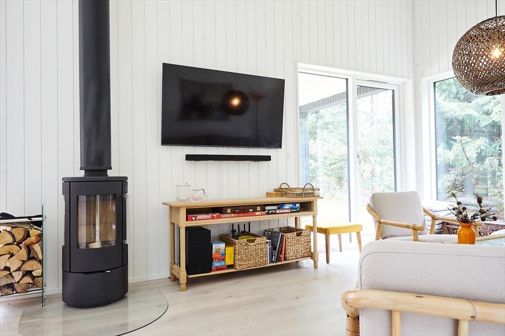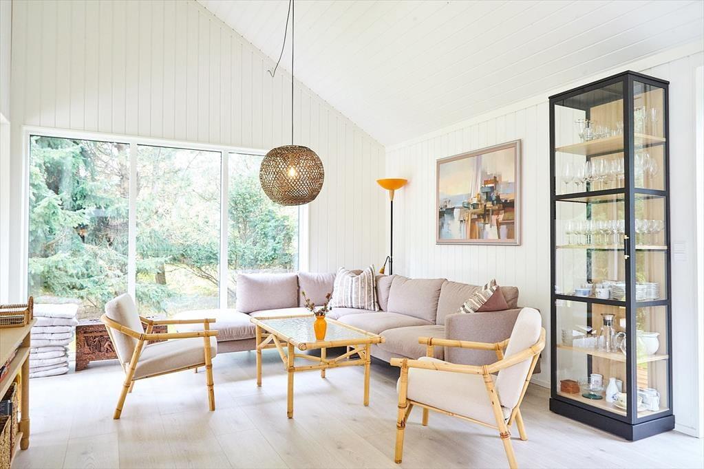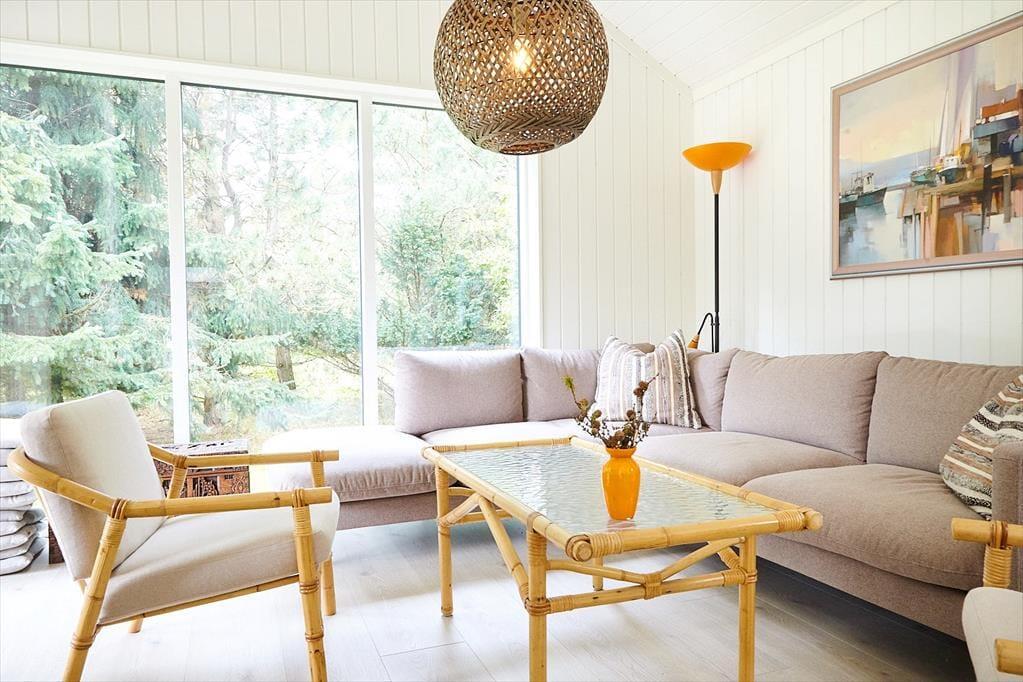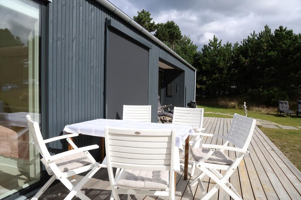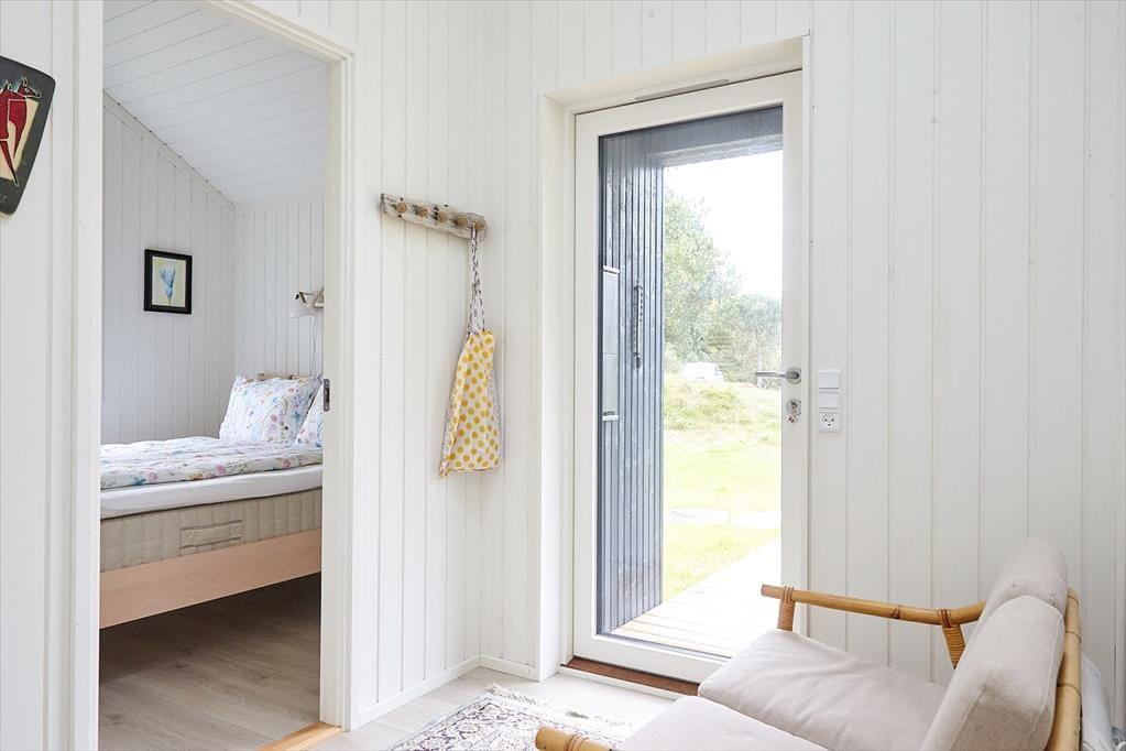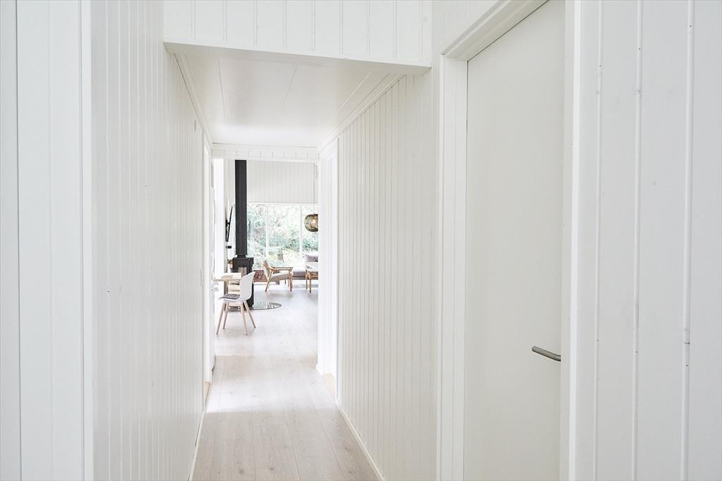 Huset er indrettet med en lækker stue, hvor der er alle muligheder for afslapning og hygge bl.a. ved brændeovnen. I forbindelse med stuen er der et stort og smukt åbent køkken, hvor I kan hjælpes om at tilberede en god frokost. Der er fire dejlige soveværelser, hems og to skønne badeværelser. I annekset er der en lækker sauna. Fra stuen er der adgang til husets helt fantastiske og meget solrige terrasse. Her kan du virkelig fornemme den helt specielle stemning af sommer og sol mens der grilles og hygges eller du måske nyder et godt glas vin. I haven kommer der ofte et rådyr forbi. Husk at benytte dig af husets udendørs bruser, hvor du kan skylle sandet af efter en skøn dag på stranden.