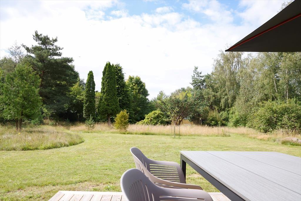 Fra stuen er der direkte udgang til den store træterrasse og en solrig have – ideel til både afslapning og leg.