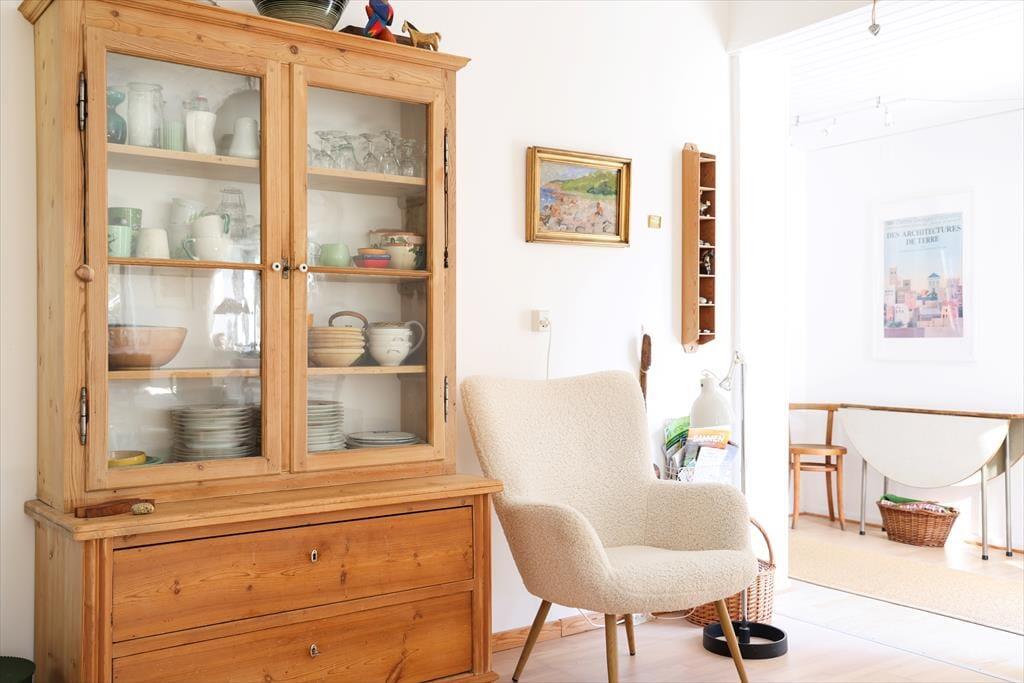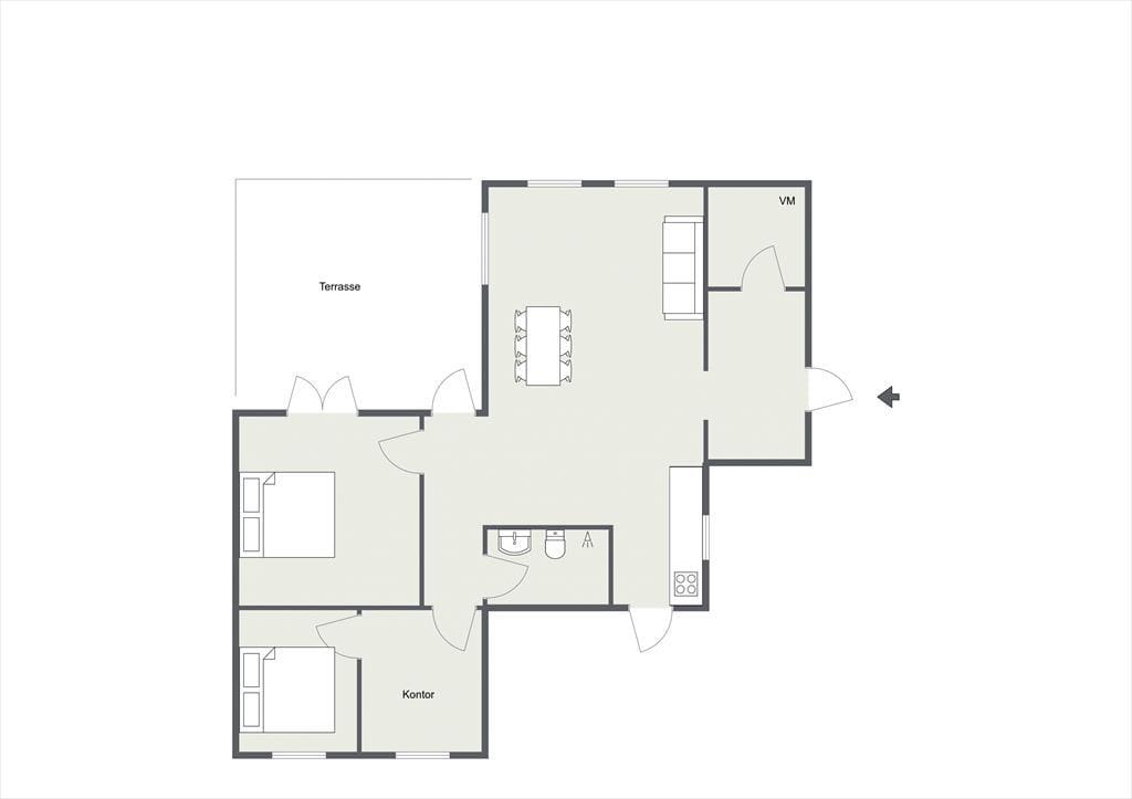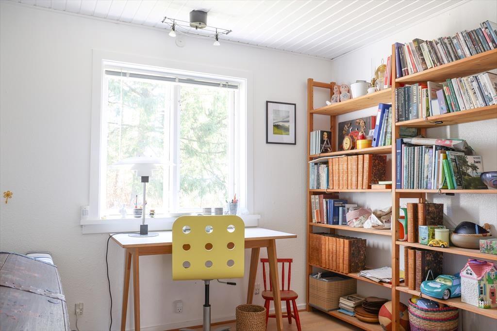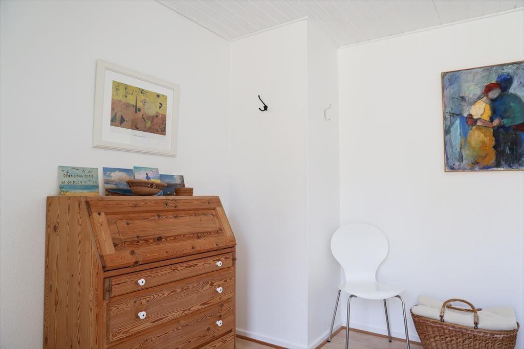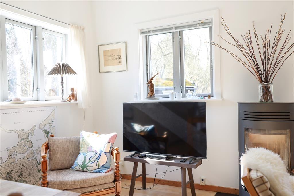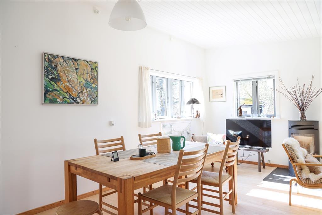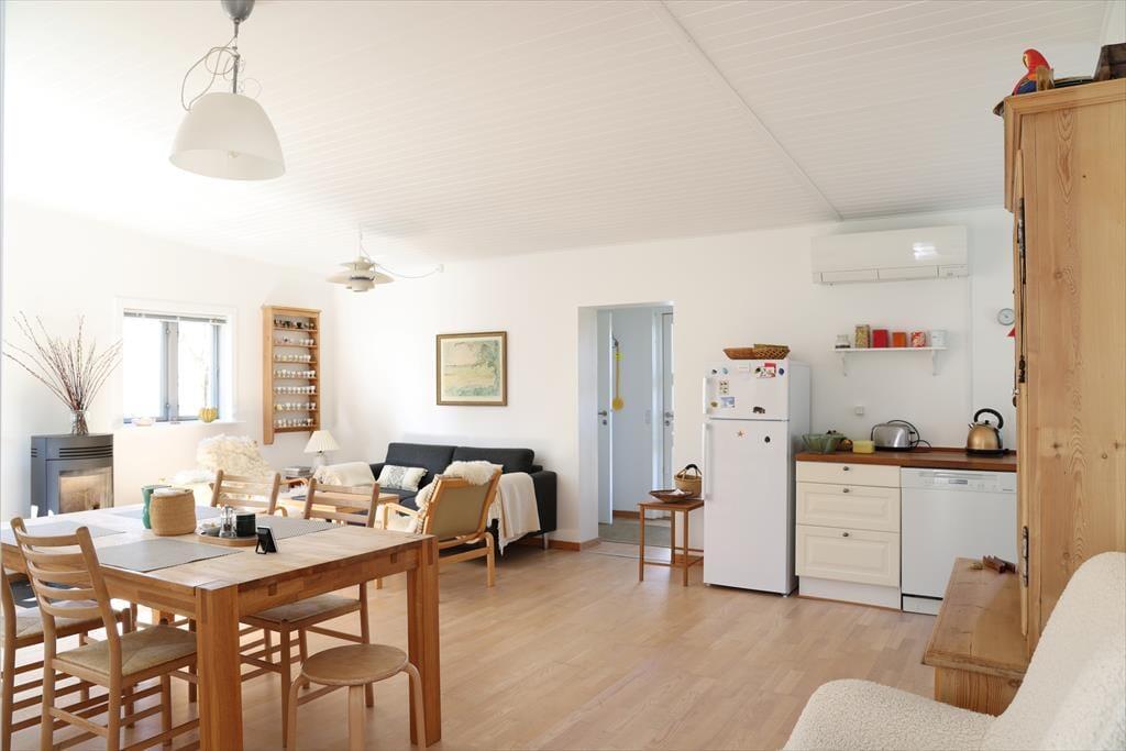 I dette sommerhus er der både hygge, charme og ægte feriestemning. Her kan sjælen plejes og der kan stresses af. Køkken og stue er tæt forenet, så står du for madlavningen kan du sagtens tage del i snakken med familien i stuen. På de kølige aftener kan der tændes op i brændeovnen og hygges med en god bog i sofaen med et tæppe omkring. Fra det ene soveværelse er der udgang til den store træterrasse.