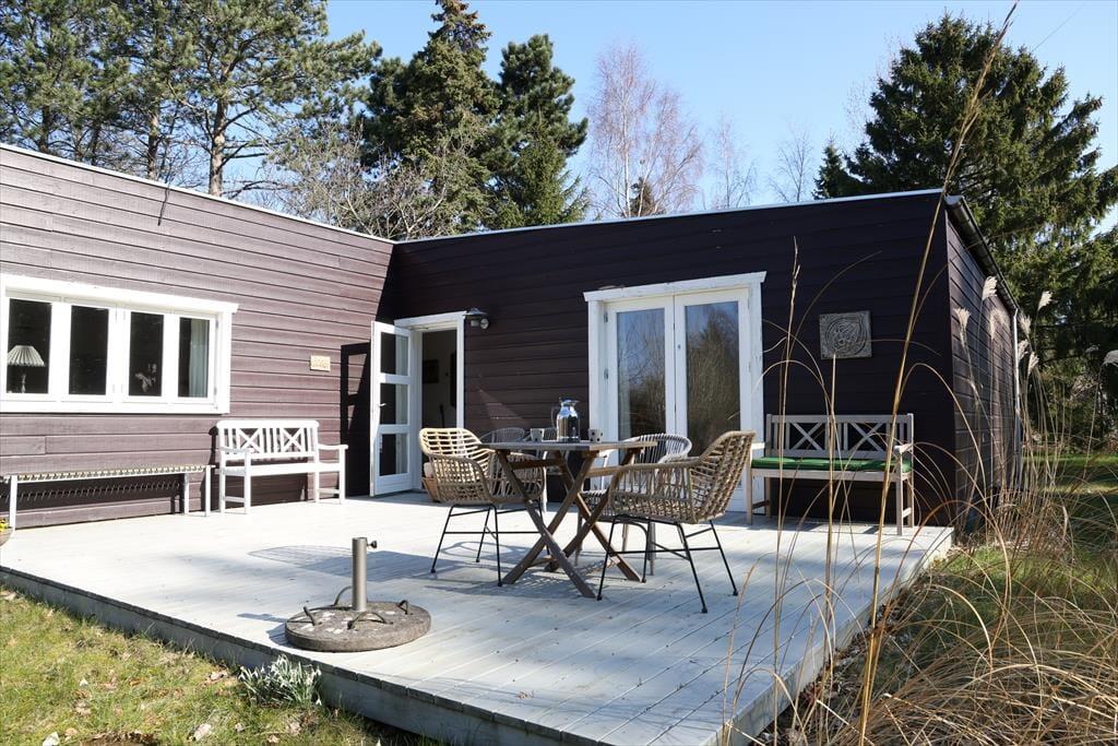 Udendørs er der masser af plads på sommerhusets store grund. Grunden er udlagt som naturgrund med stier rundt på grunden, dette for biodiversitetens skyld. Sommerhuset ligger godt tilbagetrukket på grunden; det giver ugenerte omgivelser og masser af sol på den sydvendte terrasse. Der er god mulighed for at finde læ på en af husets terrasser, hvor der plads til at nyde en god middag tilberedt på grillen, eller ligge at slikke sol. De sene sommeraftener kan nydes rundt om bålet med snobrødsbagning, hvor morgendagens planer tilrettelægges.