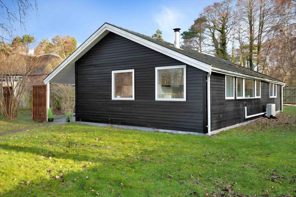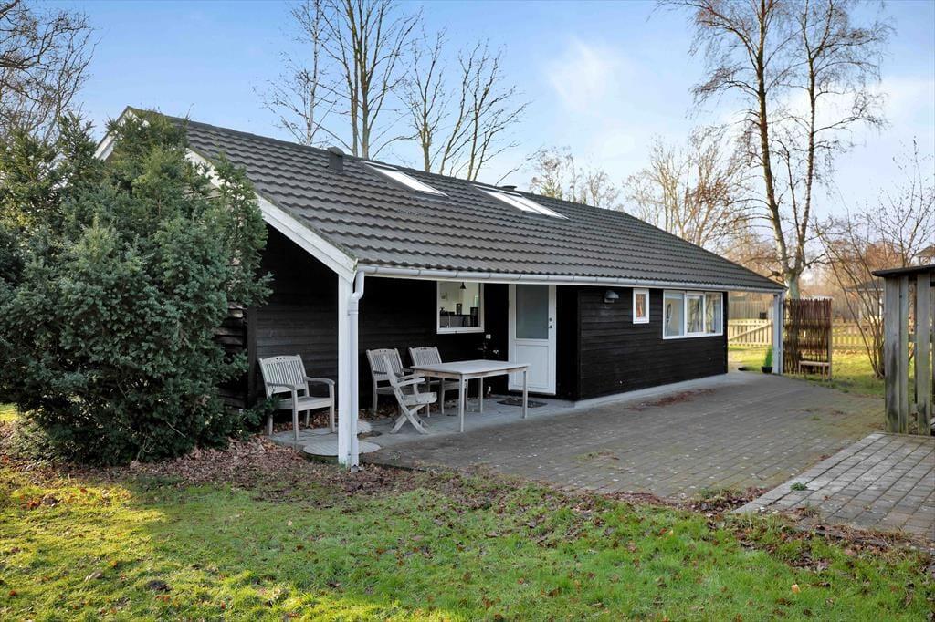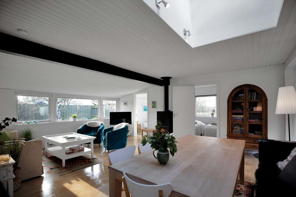 Huset indeholder stor stue med spiseplads til 6. Der er brændeovn og TV samt en masse spil til hyggelige aftener. Derudover er der 3 gode værelser med dobbeltsenge og god skabsplads. Køkkenet er åbent og indeholder bl.a. opvaskemaskine. Det fine badeværelse er med brus. Vaskemaskine og tørretumbler er placeret i entreen. Fra stuen er der udgang til den dejlige have, hvor rådyrene jævnligt krydser og hvor der er flere dejlige terrasser både overdækkede og åbne.