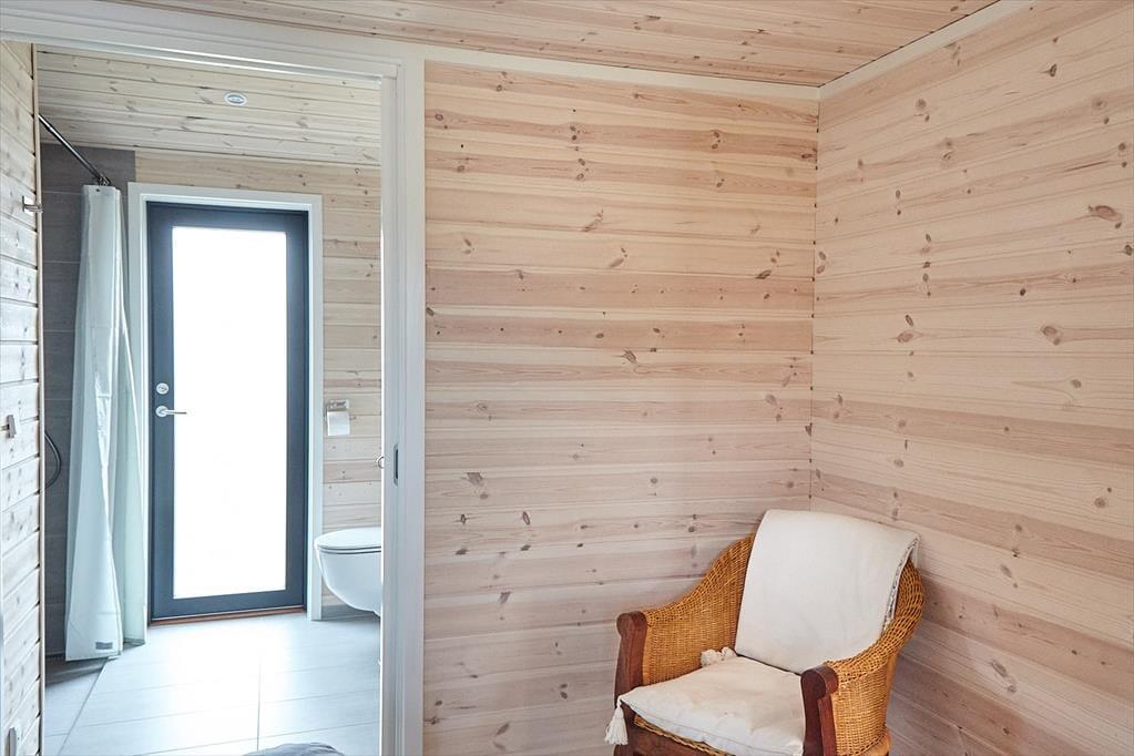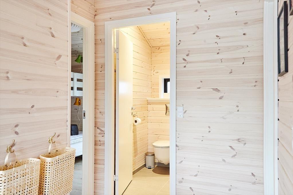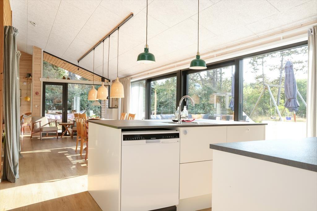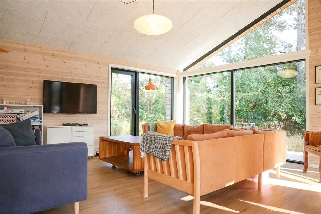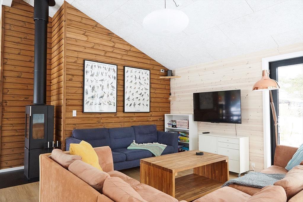 Huset er indrettet med entré, hvor der også er vaskemaskine og tørretumbler. Stort soveværelse med dobbeltseng og adgang til badeværelse. I entré er der adgang til hems med 2 sovepladser. Stort lyst køkken-alrum med god spiseplads, hyggekrog, og udgang til stor træterrasse. Soveværelse med køjeseng. Badeværelse. Soveværelse med dobbeltseng. Stue med brændeovn, TV (kun streaming), og udgang til overdækket terrasse. Herudover er haven anlagt med græsplæne og naturgrund for biodiversitetens skyld i den resterende del.