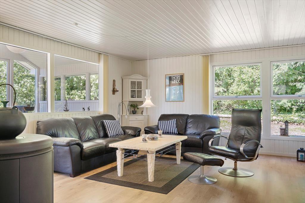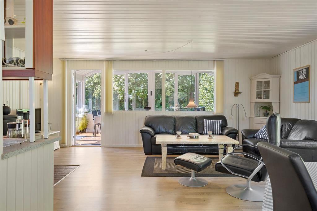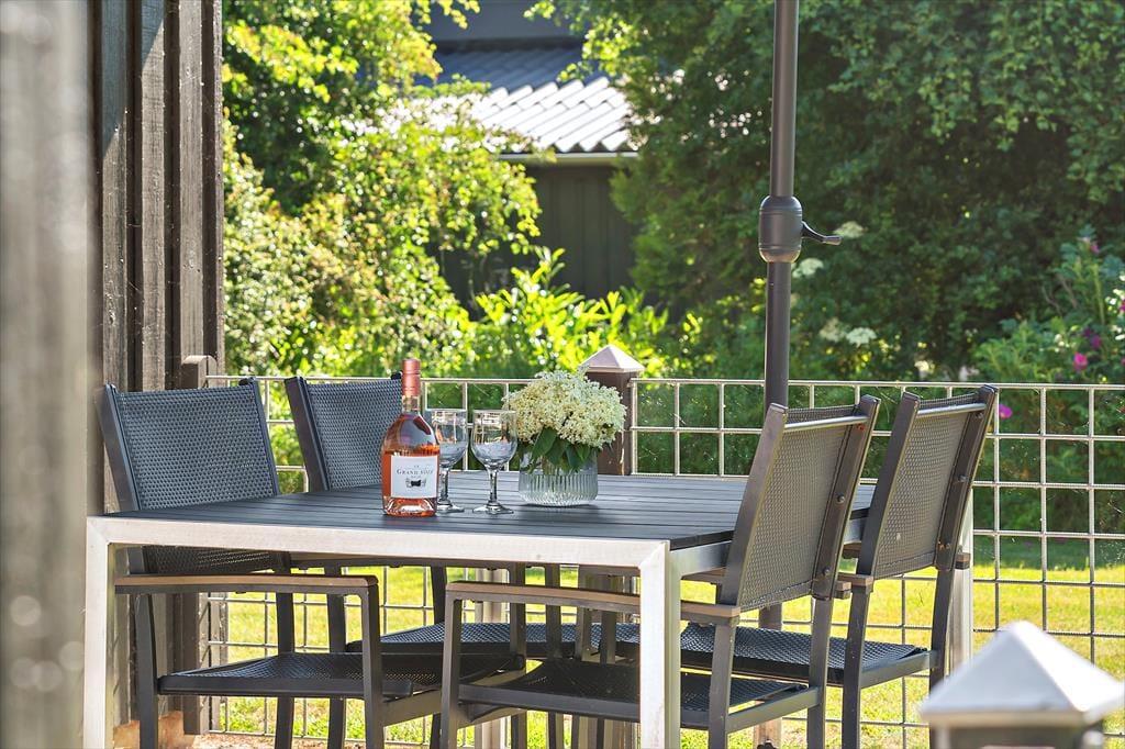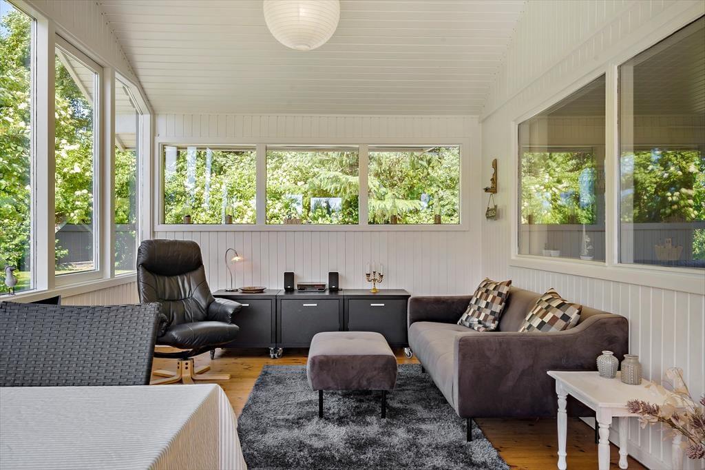 I forlængelse af stuen finder I den dejlige udestue med spisebord, sofa og lænestol – et skønt ekstra rum, hvor I kan nyde lyset og roen og forlænge de hyggelige sommeraftener. Efter en dag fyldt med oplevelser ved fjorden eller havet kan I sænke skuldrene i husets sauna og lade varmen gøre sit.