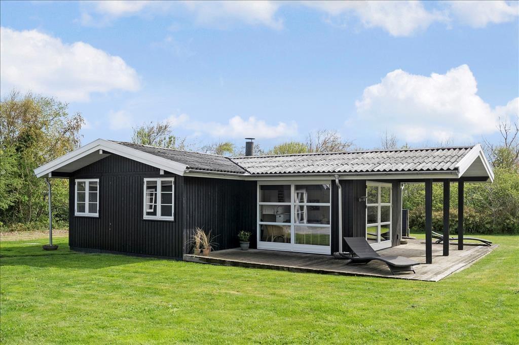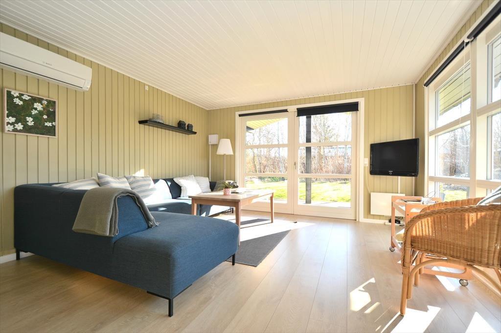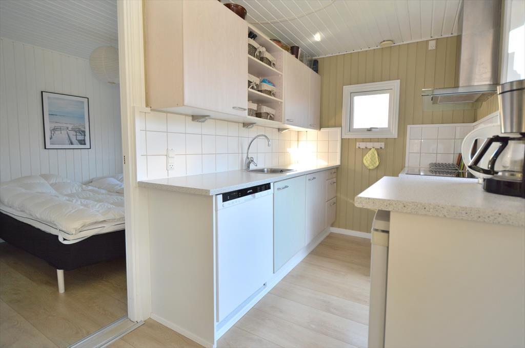Dette hyggelige sommerhus i Nr. Fjand byder på masser af privatliv og en afslappet feriestemning, hvor det er nemt at føle sig hjemme. Stuen er husets hjerte og det naturlige samlingspunkt, hvor hele familien kan samles til hygge, spil og gode samtaler. Køkkenet ligger i et praktisk indhak med åben forbindelse til stuen, så samtalen let kan holdes kørende – også når der står én og laver mad, mens andre slapper af i sofaen. De store vinduespartier i stuen sørger for et skønt lysindfald og giver en lys og indbydende atmosfære, som gør det rart at være sammen hele dagen.