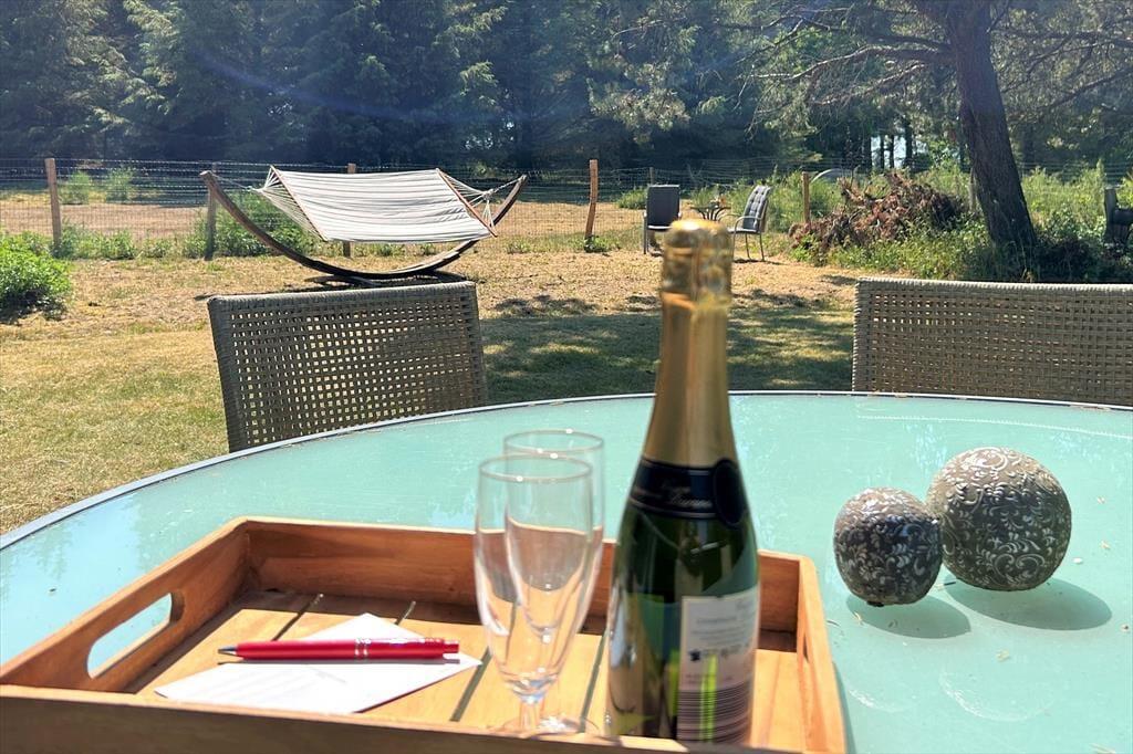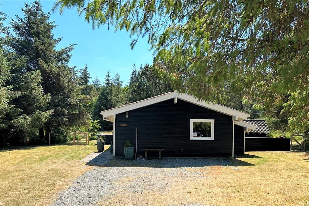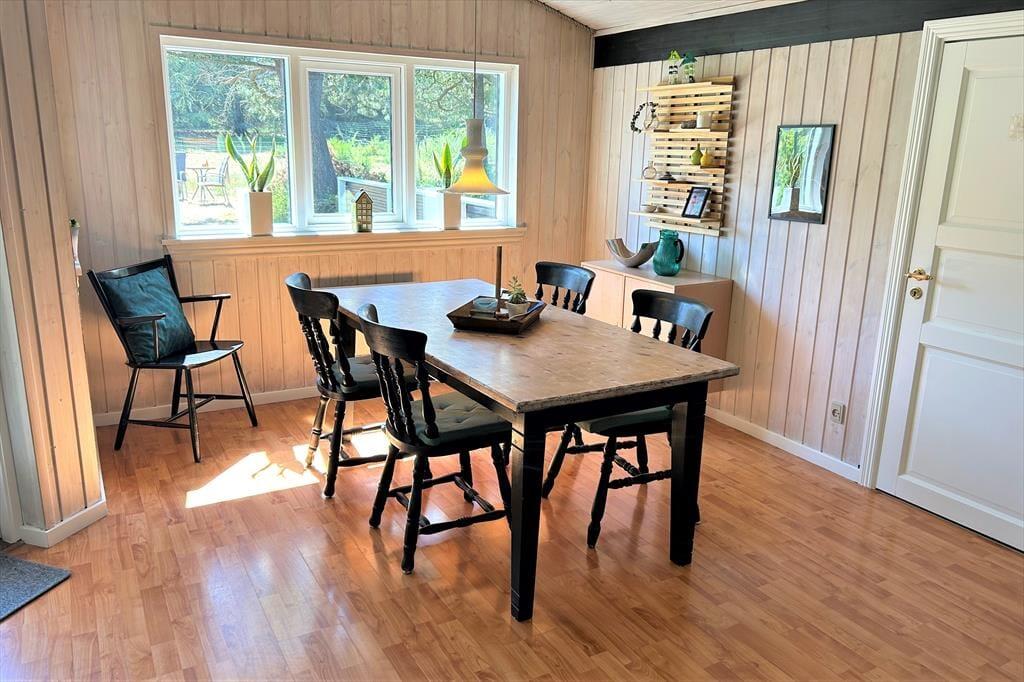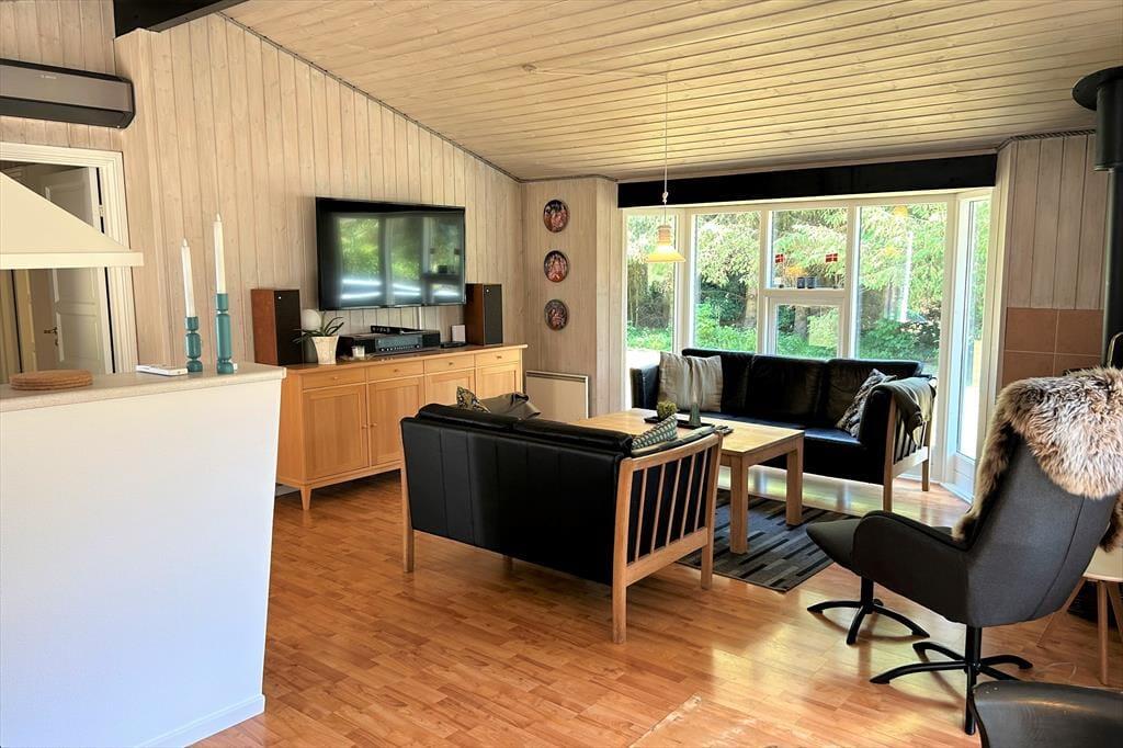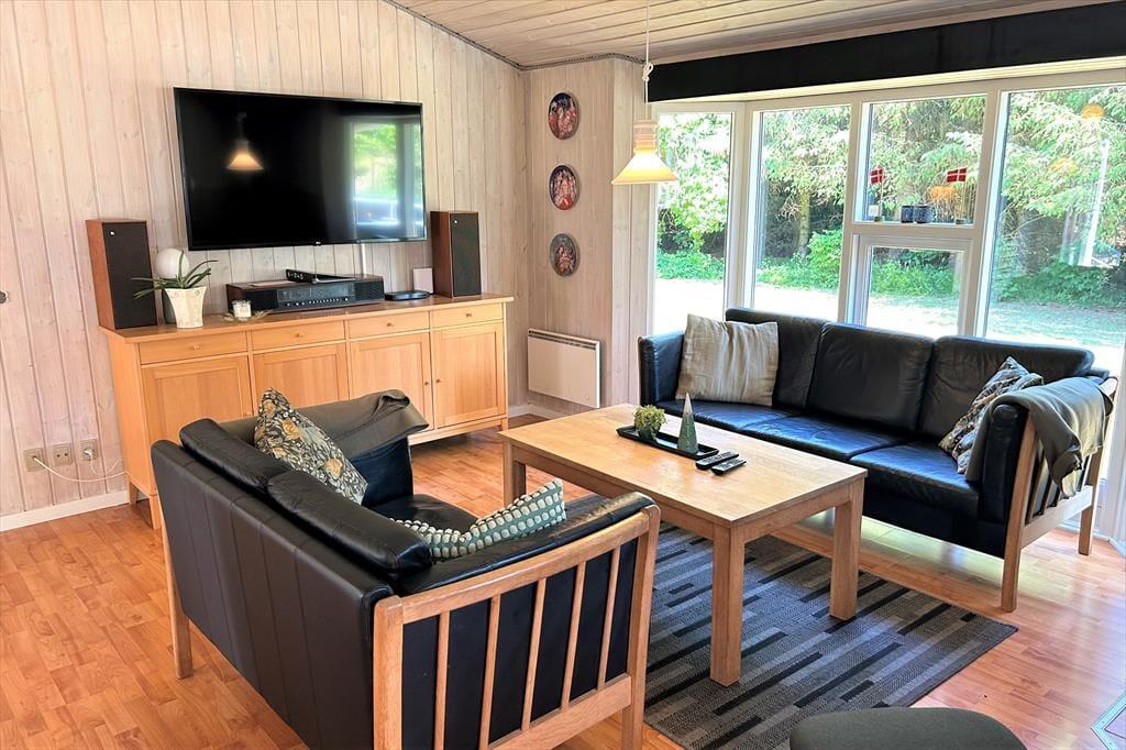 I vil elske dette charmerende træferiehus, der er smukt placeret på en naturgrund med masser af læ og privatliv. Her kan I virkelig koble af og nyde ferien i rolige omgivelser, hvor fuglesang og den friske luft er en del af hverdagen. Fra den hyggelige stue træder I direkte ud på en sydvendt, delvist overdækket terrasse – perfekt til solrige morgenstunder, lange frokoster eller aftener med grill og god vin. Her står komfortable havemøbler klar til jer. På husets vestside finder I endnu en dejlig terrasse, hvor I kan nyde solen helt til den, går ned. Et ideelt sted til både afslapning og samvær midt i naturen.