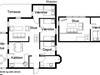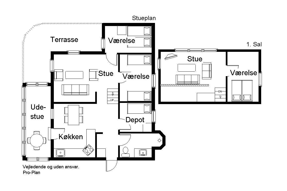 Indretning: Entre, køkken med lille spiseplads og udgang til flot udestue, hvorfra der er videre udgang til den delvis overdækkede terrasse. Opholdsstue med brændeovn, værelse med 2 enkeltsenge, badeværelse samt værelse med lille dobbeltseng (120 cm).