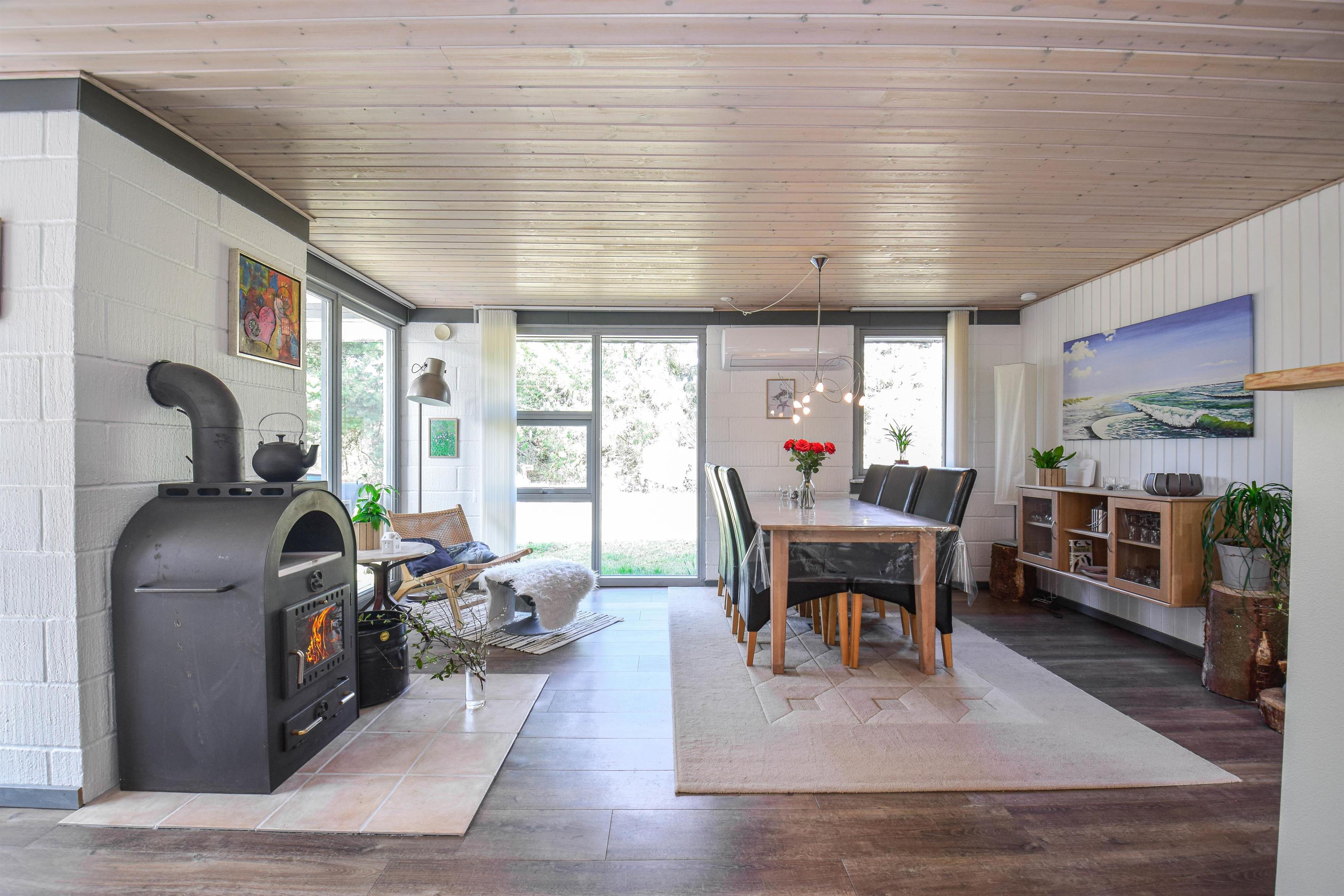 Husets hjerte er det store, åbne køkken-alrum med stue, hvor der er god plads til samvær. Her kan du slappe af i sofaen med en god bog eller tænde op i brændeovnen, mens maden simrer i køkkenet.