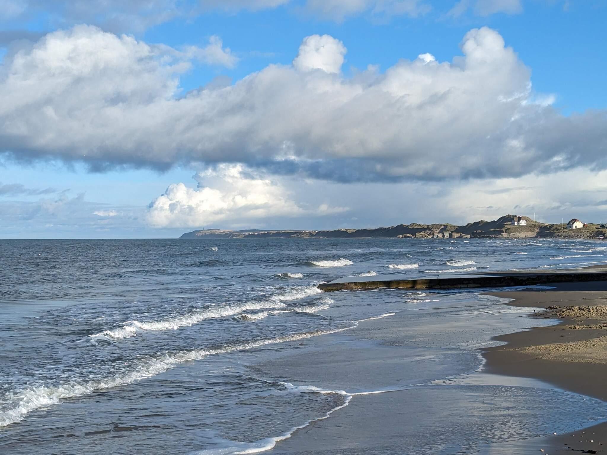 Ferielejlighed med 180 grader panorama havudsigt beliggende på 1. sal i feriecentret Lyngby Mølle. Her er bl.a. udsigt til Nr. Lyngby´ lidt særprægede kyst, der bærer præg af den brede sandstrand og stejle kystlinje.