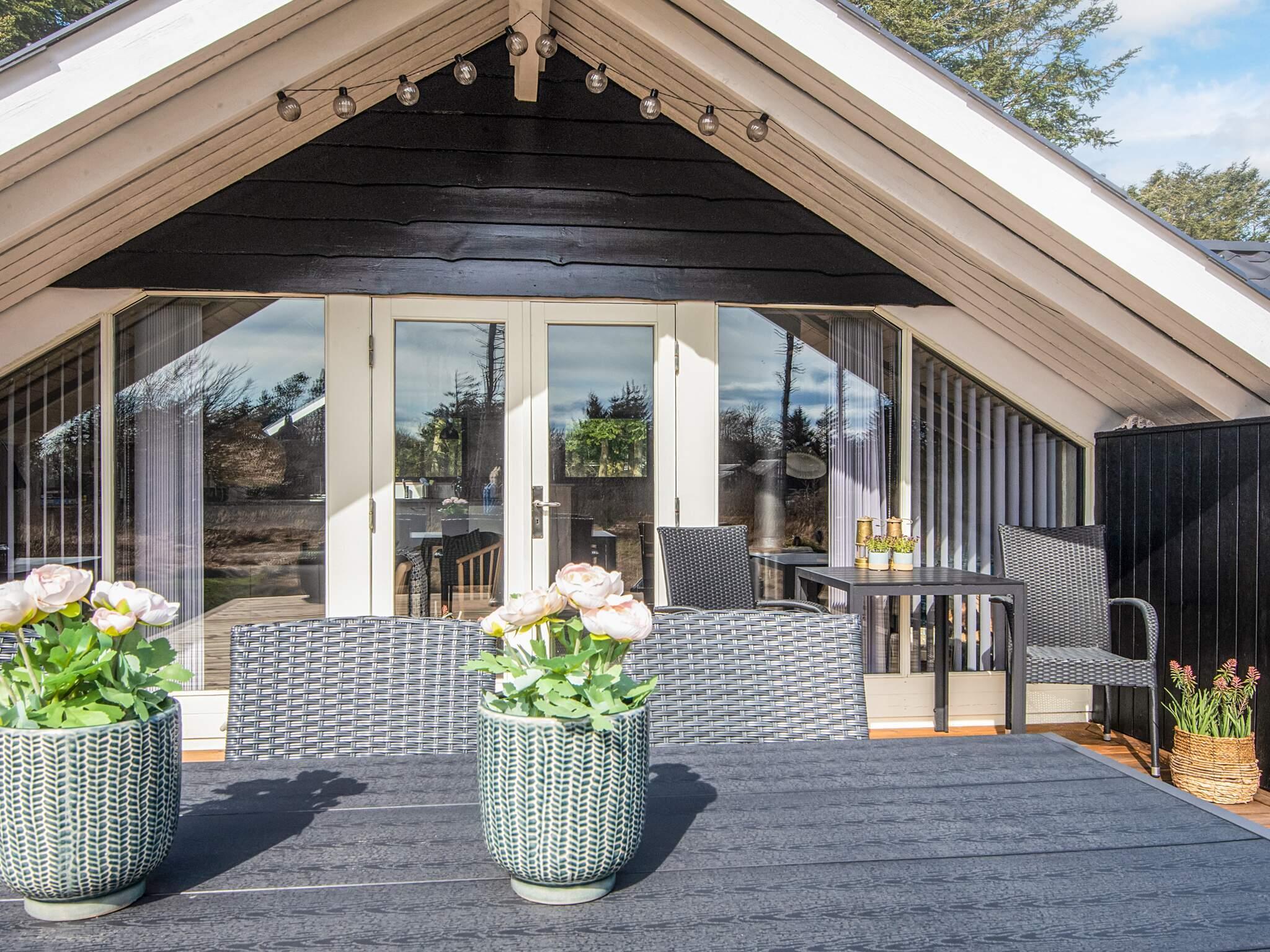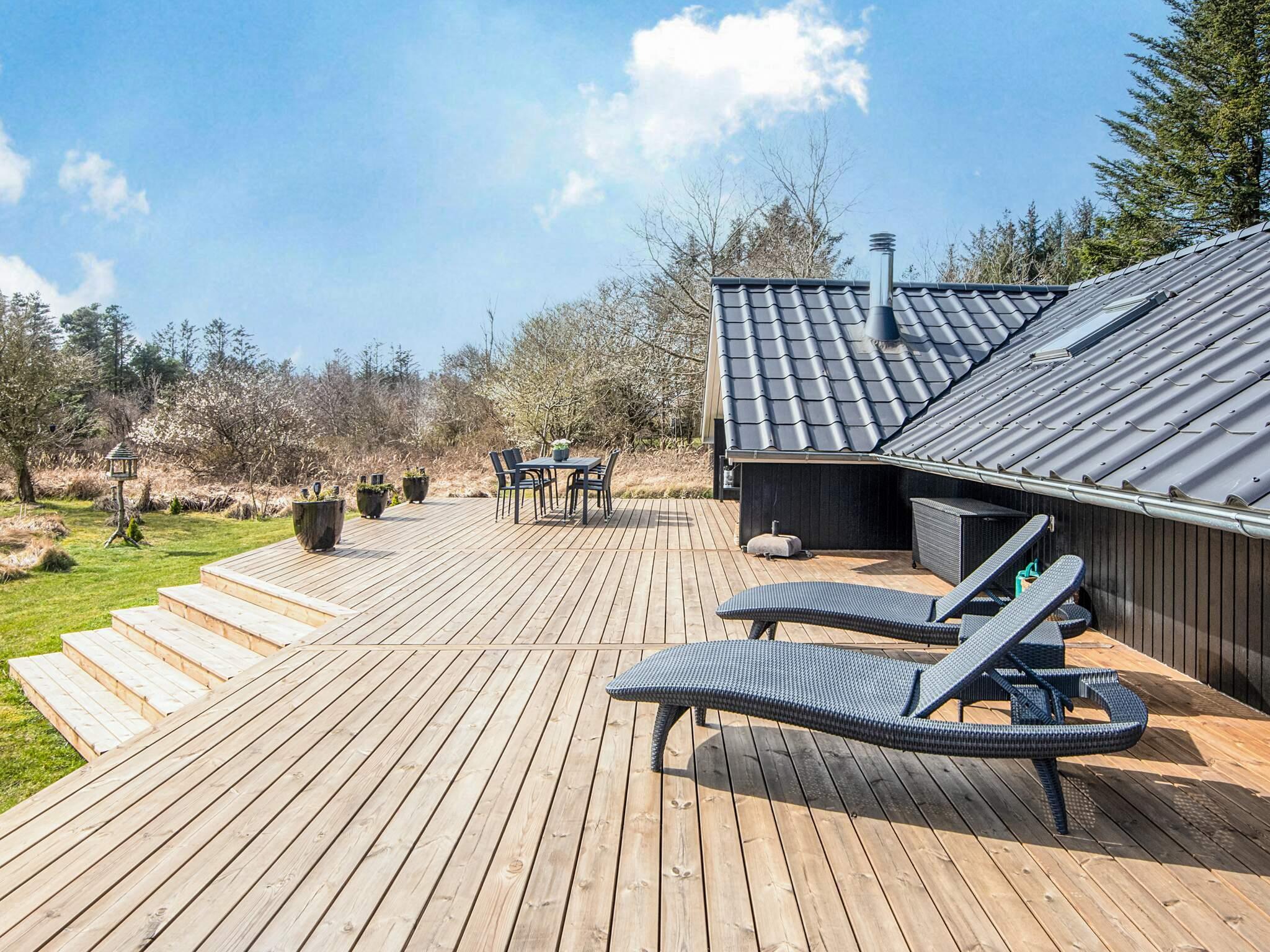 Der er anlagt en stor åben terrasse, her kan I opholde jer ugenert. Fra terrassen er der direkte adgang til den store, kuperede naturgrund. Udlejes ikke til ungdomsgrupper.