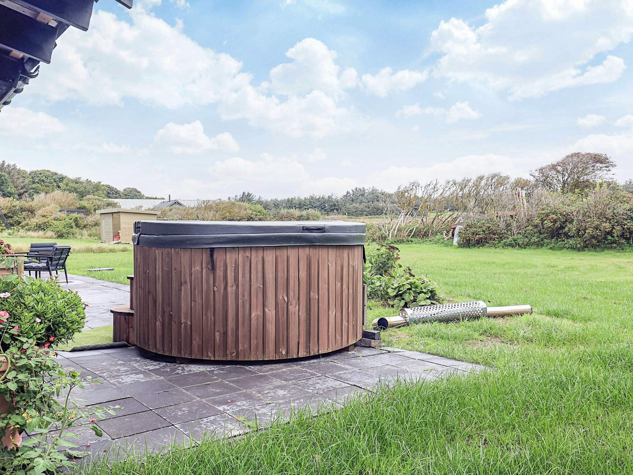 Udendørs er der en dejlig terrasse med havemøbler, hvor man kan nyde solen, grille og sidde helt ugenert og nyde stilheden og naturen. På terrassen er der et vildmarksbad til dem der ønsker at slappe af i det. En stor overdækket terrasse er der også. Grunden giver gode muligheder for leg og afslapning og der er opstillet en shelter til fri afbenyttelse i det ene hjørne af grunden.