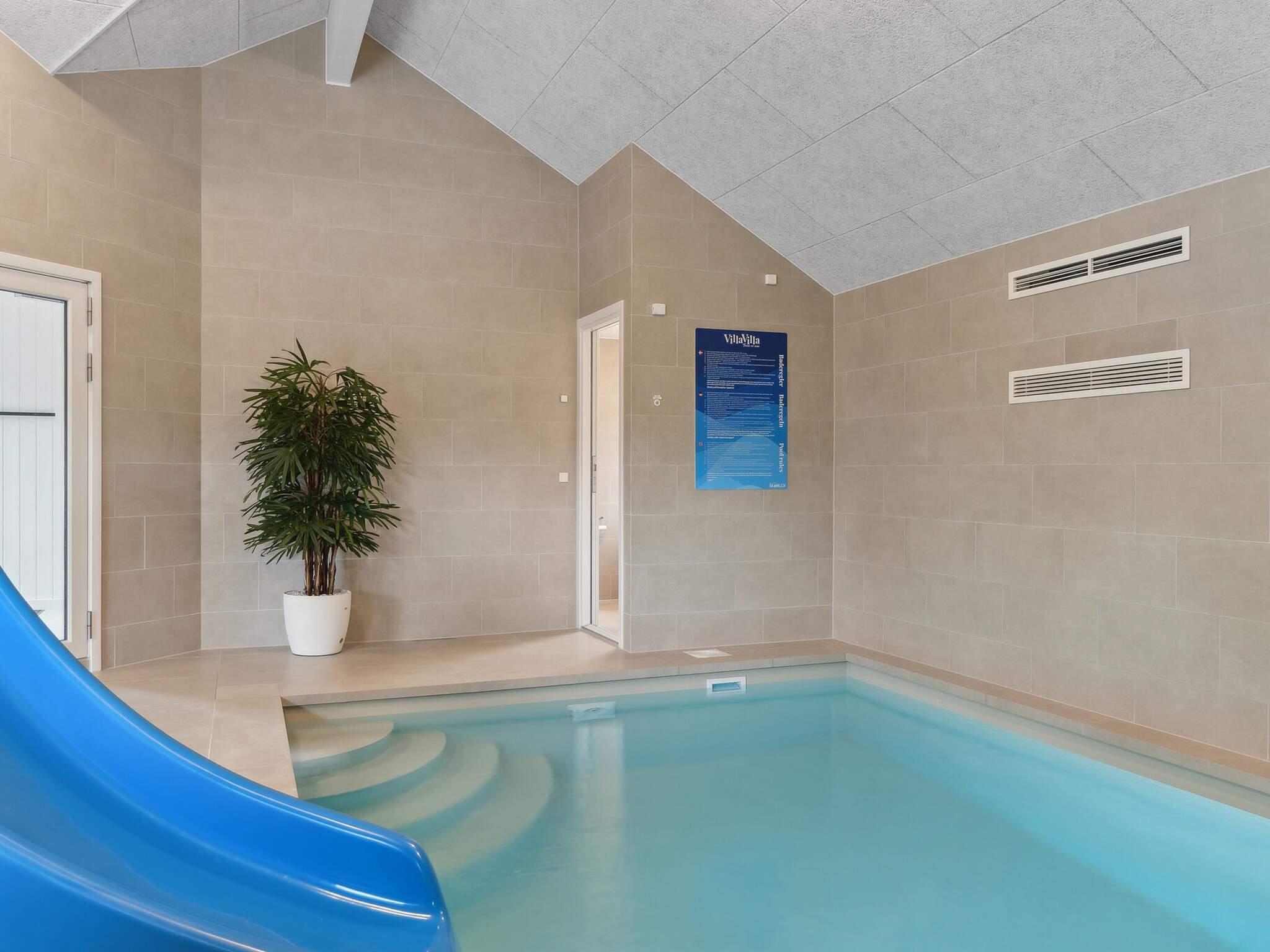 Når du træder ind i huset, bliver du mødt af det imponerende poolområde. Her finder du en pool med tilhørende vandrutsjebane, som er et hit hos både børn og voksne. Fra poolområdet har du direkte udsigt til husets hjerte – det store køkken-alrum med brændeovn. I stuen kan I samles i det hyggelige sofaområde til filmaftener eller nyde måltiderne sammen ved det lange spisebord med plads til alle 20 gæster. Det moderne køkken er fuldt udstyret og perfekt til at tilberede lækre feriemåltider.