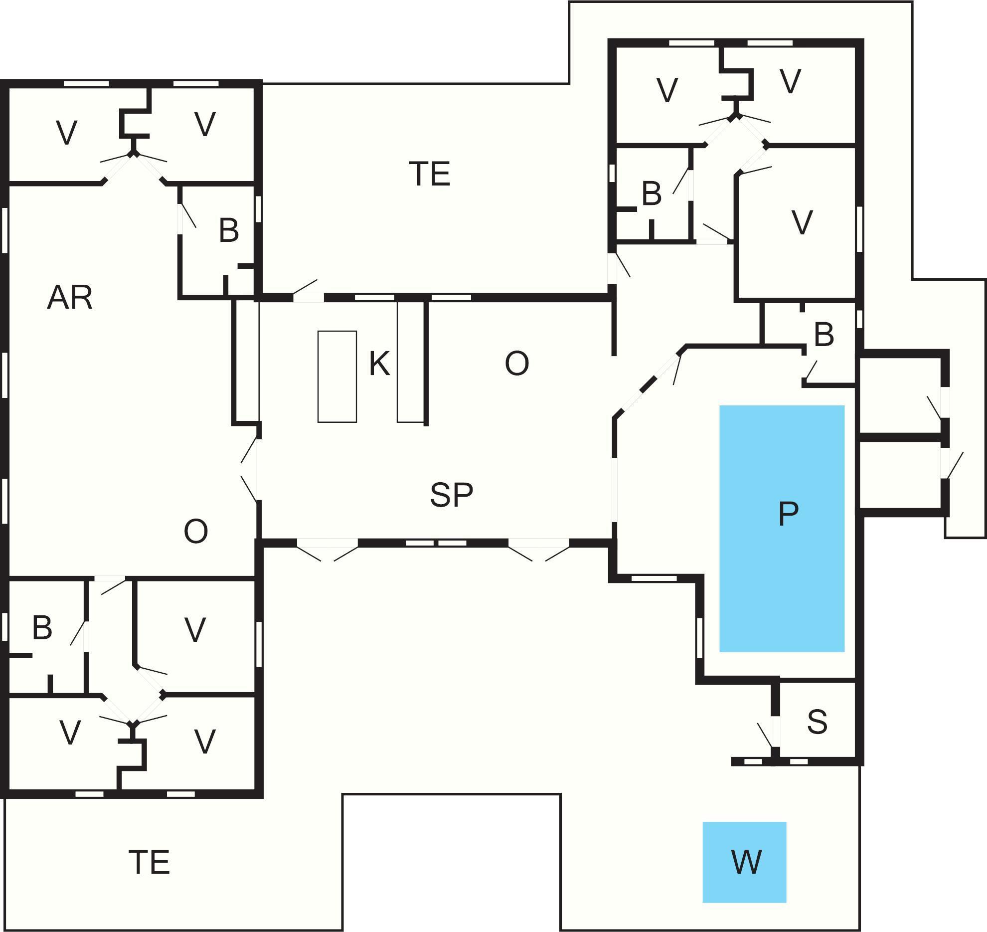 Fra entreen har du også adgang til den imponerende pool afdeling og det store, lyse køkkenalrum. Pool afdelingen er et hit blandt alle gæster med en skøn pool og en sjov vandrutsjebane, hvor både store og små kan lave seje tricks. Fra pool området kan du kigge direkte ind i køkkenalrummet, så hele familien kan være sammen, selv når nogen boltrer sig i vandet.
