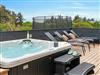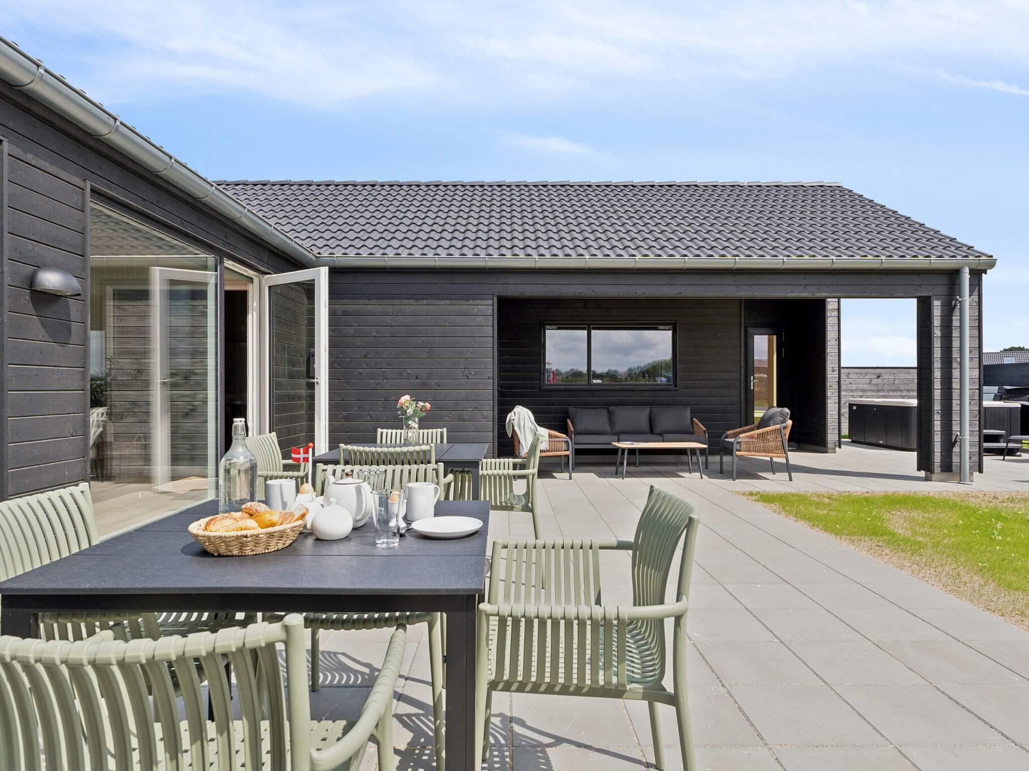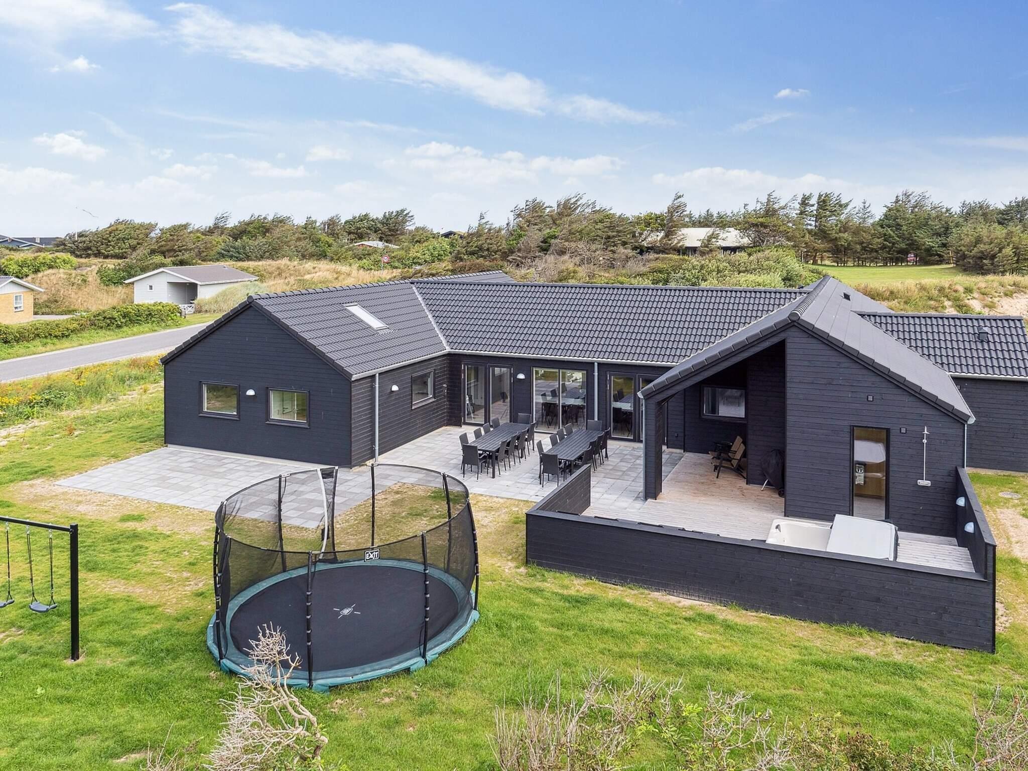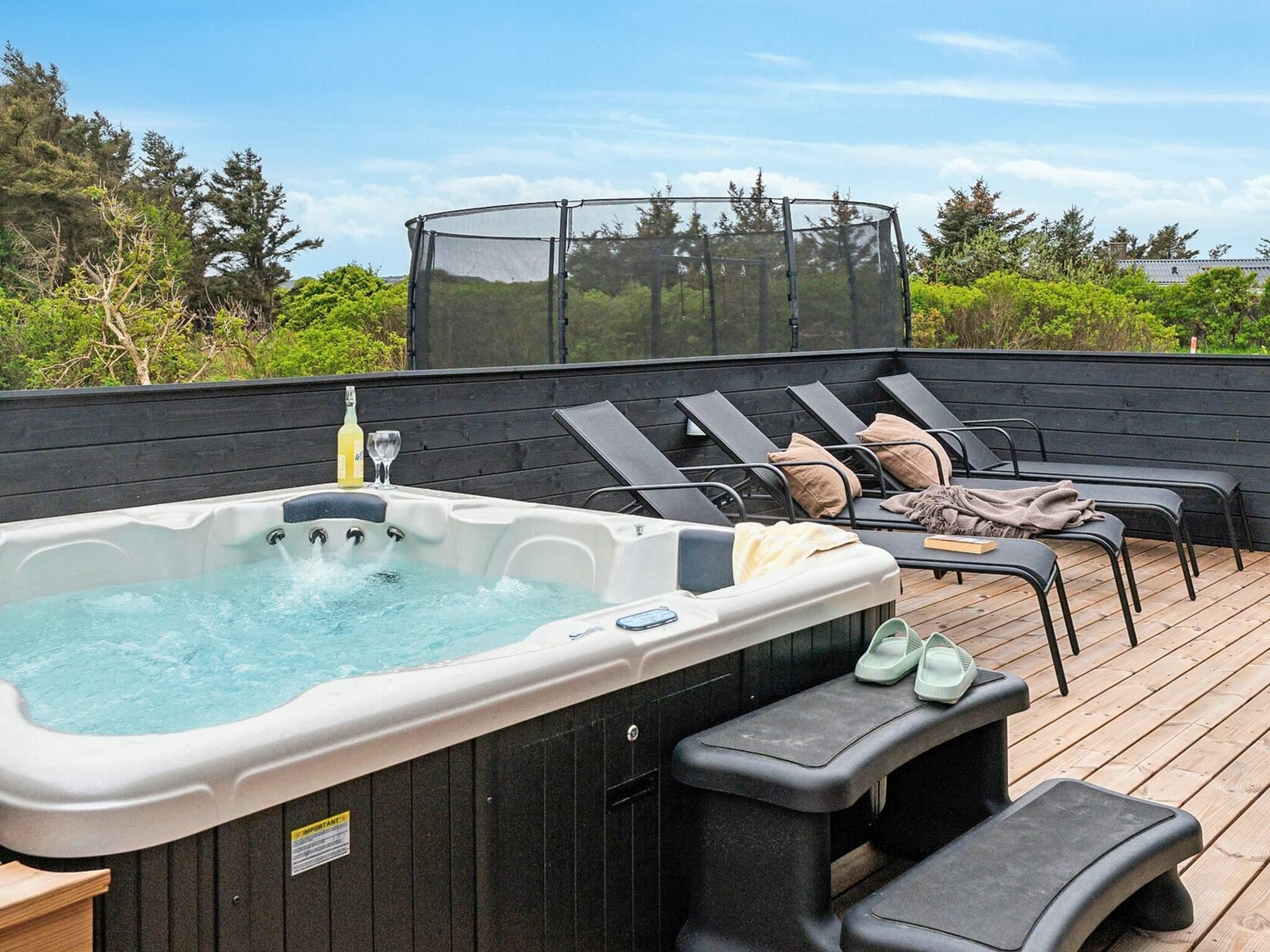 Når du bevæger dig udenfor, åbner der sig endnu flere muligheder for at skabe fantastiske minder sammen. Den delvist overdækkede flotte træterrasse er udstyret med havemøbler og grill, perfekt til hyggelige grillmiddage. På den store terrasse finder du også den udendørs wellnessafdeling med en trappeopbygget udespa, udesauna og udebruser – her kan du virkelig forkæle dig selv under åben himmel. For turens yngste gæster finder du udendørs også trampolin og gynger.
