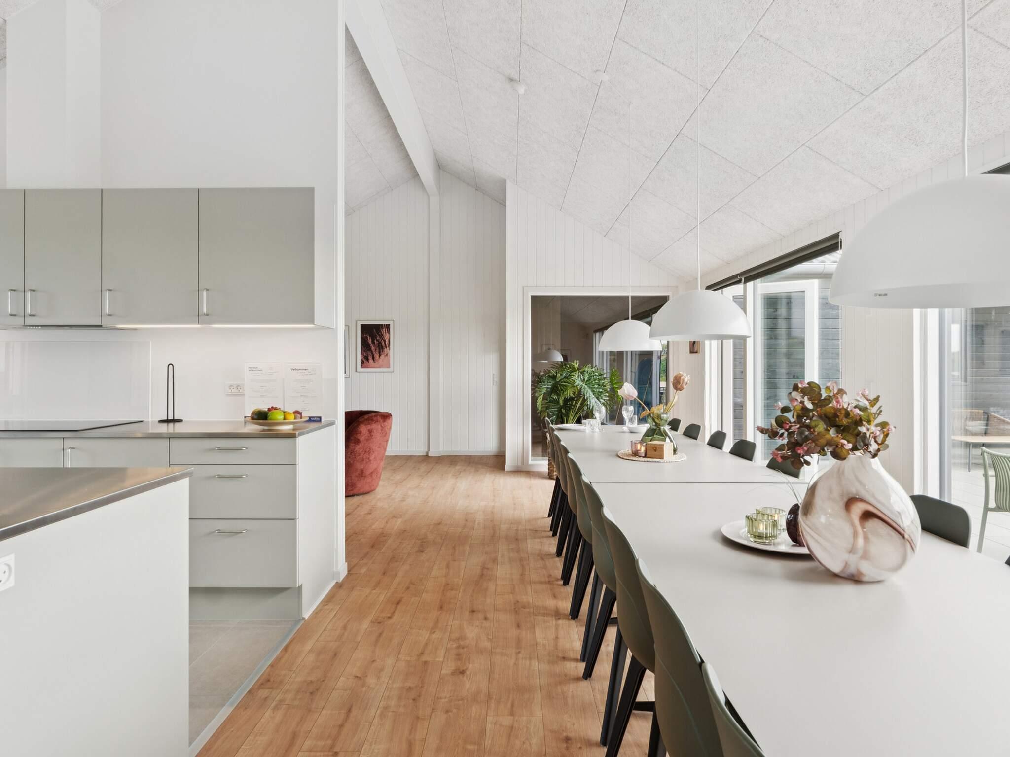 Køkkenalrummet er hjertet i huset. Her finder du en hyggelig sofaafdeling, hvor du kan samles og nyde gode film. Det store fællesrum byder også på et langt spisebord, hvor måltiderne kan nydes i fællesskab, og det moderne, fuldtudstyrede køkken er perfekt til at skabe uforglemmelige madoplevelser sammen.