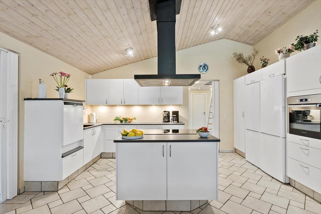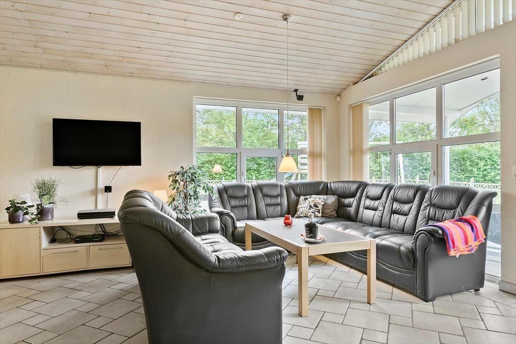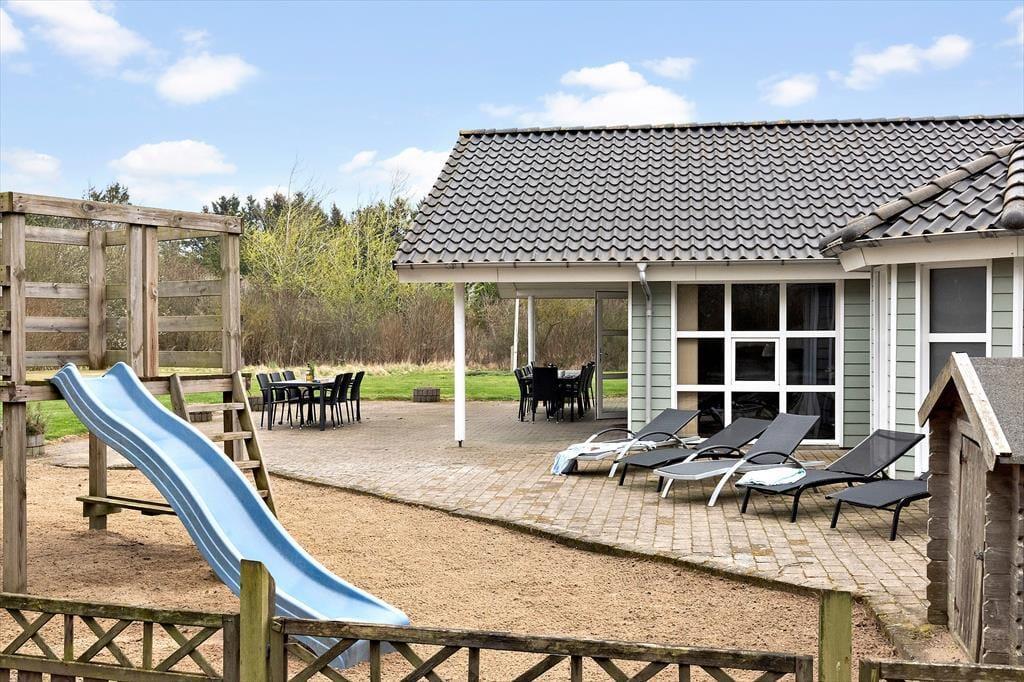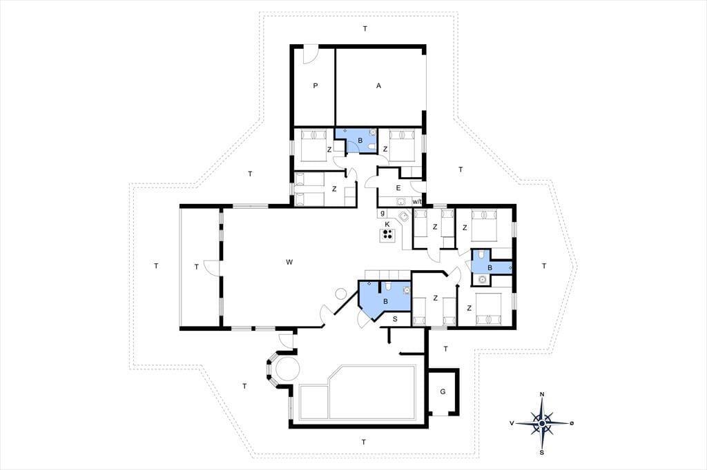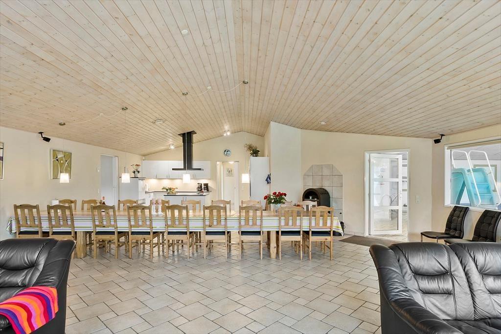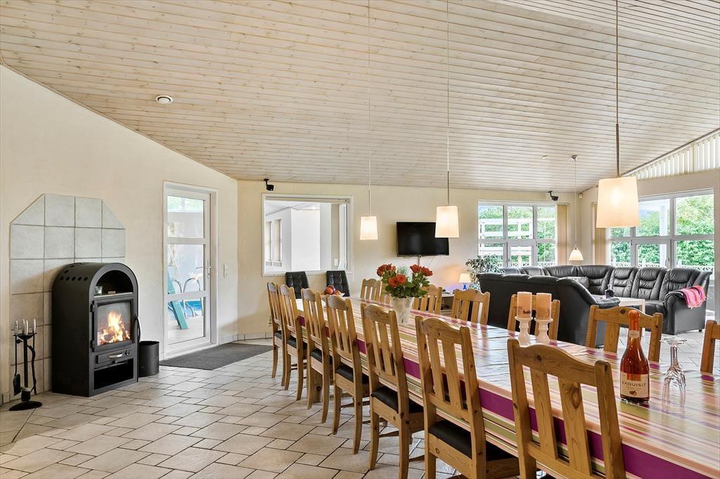 I dette sommerhus på 380m2 har man gode rammer og mulighed for mange aktiviteter, både ude og inde eller i det tilhørende aktivitetsrum. Her er rigeligt med plads og faciliteter til at være flere familier afsted sammen, og vi anbefaler også huset til de, der gerne vil fejre en begivenhed eller mærkedag i familiens skød. Feriehuset er praktisk indrettet med opholdsrummet i centrum og værelserne fordelt på to fløje med følgende sengepladser; Fløj 1: Tre soveværelser, badeværelse og en hems med to madrasser på gulvet. Fløj 2: Fire soveværelser, badeværelse og hems med fire boksmadrasser på gulvet. Fra opholdsrummet med spiseplads og sofaafdeling til alle overnattende, er der vinduesparti og adgang til det store poolrum samt til den overdækkede del af terrassen. Huset har fjernsyn i stuen samt i soveværelserne og på hemsene - vær dog opmærksom på, at der på disse fjernsyn kun kan ses den kanal, der ses i stuen - dette gælder også for afspilning af DVD-film. Af andet udstyr kan nævnes vaskemaskine og tørretumbler til de mange ture i poolen, gratis og trådløst internet og parabol. Et hus som indbyder til leg, sjov og hygge med hele familien eller vennekredsen.