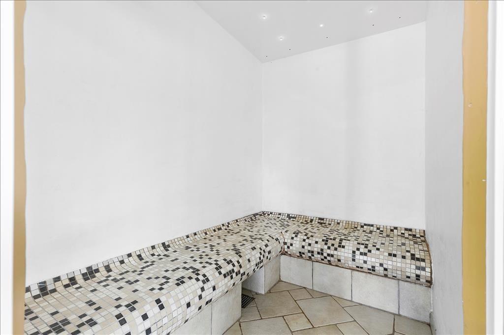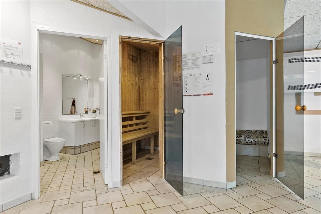 Fra opholdsrummet er der adgang til det 22m2 store bassin med en rutsjebane som nok skal vække begejstring hos børnene. De voksne kan slappe af i det indbydende spabad og nyde børnenes leg, evt. efterfulgt af en tur i saunaen eller dampbadet - her er desuden bad og toilet.