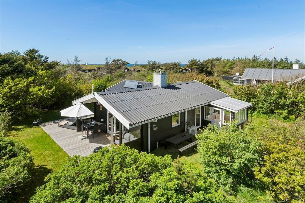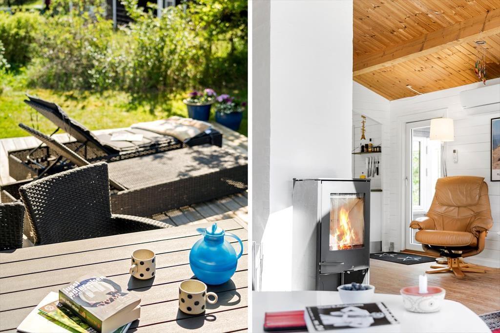 Når solen står højt på himmelen, er det måske ikke indendørs hygge ved brændeovnen, der trækker. I stedet er det skønt at kunne slå sig ned på sommerhusets delvist overdækkede træterrasse, der er orienteret mod syd og vest. Fra husets terrasse i grundens nordvestlige hjørne, kan I få et havkig. I kan altså nyde solnedgangen med kig til havet på solnedgangsterrassen i grundens vestlige del. Mod øst ligger der også en lille skøn terrasse med bord-bænkesæt, hvor morgenkaffen kan nydes i solen. Så uanset tidspunktet på dagen er det muligt at finde en siddeplads i en solstråle på den ugenerede, grønne grund. På grunden finder I også et hyggeligt bålsted og hængekøje i lækrogen.