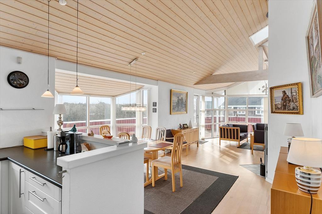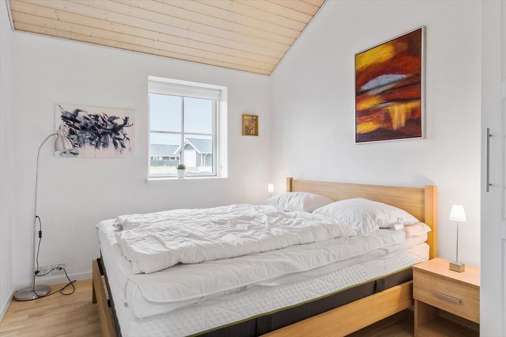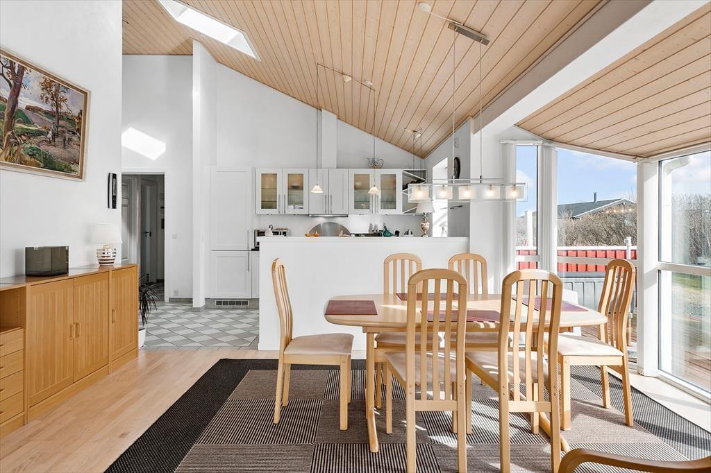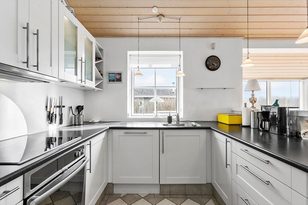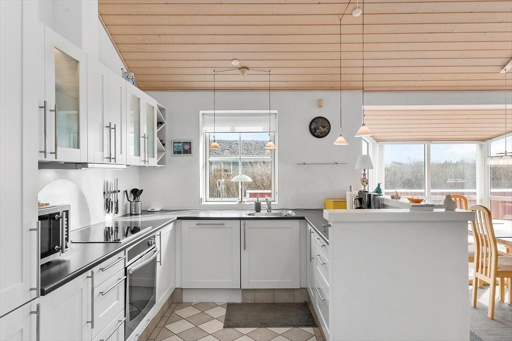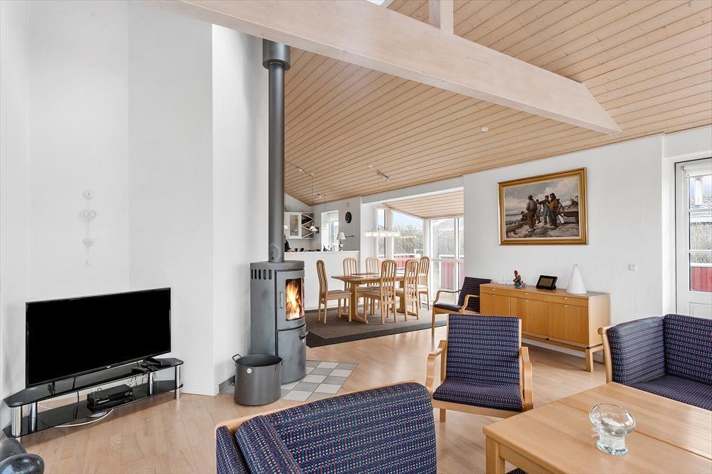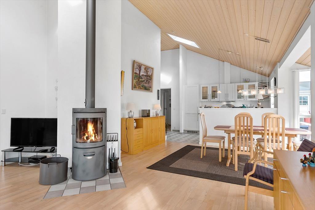 Inden døre har I hele 125 m2 at brede jer på, så I har god plads til at være op til seks personer. To af soveværelserne er med dobbeltseng og det tredje med en dobbelt sovesofa, og så er der ikke bare et, men to badeværelser, hvilket er praktisk, når I skal gøre jer klar om morgenen. I det åbne køkken kan I tænde for kaffemaskinen og trylle dagens første måltid frem, og lækkerierne kan indtages ved spisebordet, der står ved et af stuens store vinduespartier. Ikke bare de store vinduer, men også de lyse farvetoner og den gode loftshøjde skaber en let og luftig atmosfære inden døre i stuen, og en brændeovn står klar til at sprede varme og hyggestemning.