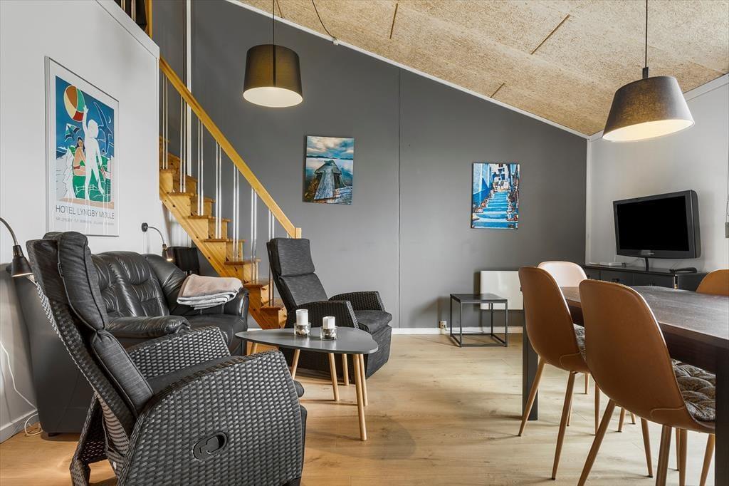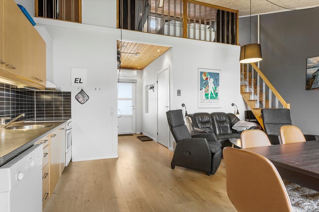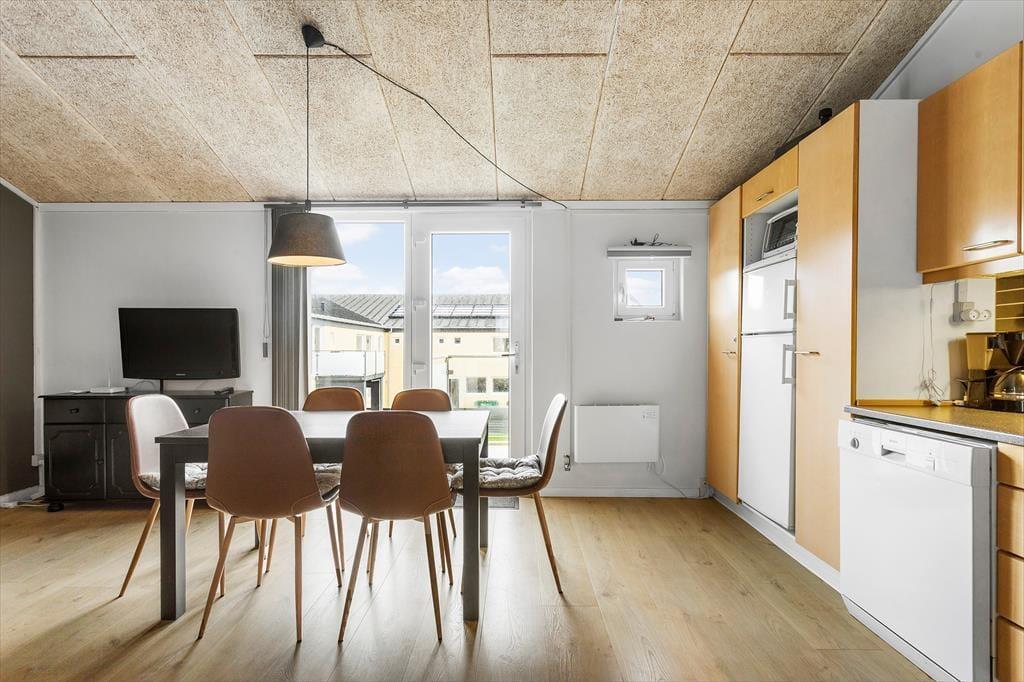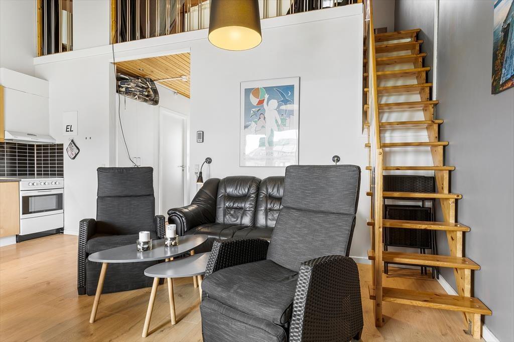 Lejligheden er indrettet i en lys og venlig stil, og her vil I hurtigt føle jer hjemme. Hjertet af boligen er det åbne opholdsrum, hvor køkken og stue smelter sammen, så man kan hygge sig med madlavningen og samtidig følge med i snakken rundt om bordet. De store vinduer lader dagslyset strømme ind, og skaber en let og indbydende stemning i rummet. Når dagen går på hæld, er det oplagt at finde en god bog frem eller samles til en film i sofaen, mens I lægger planer for morgendagens eventyr. Lejligheden rummer desuden et badeværelse samt et soveværelse i stueplan og et ekstra værelse på hemsen – perfekt, hvis I er to par eller en lille familie, der gerne vil have lidt privatliv. Det hele fremstår velholdt og indbydende efter en gennemgribende renovering i 2006.