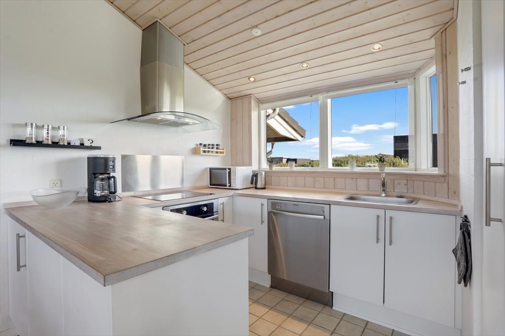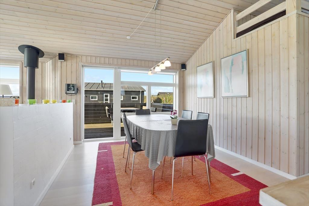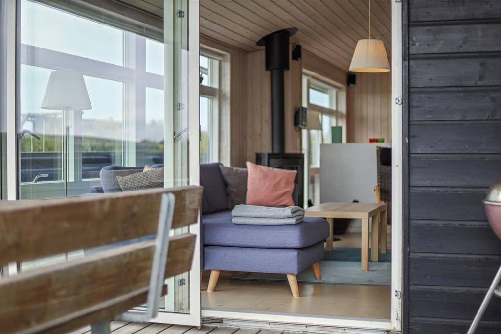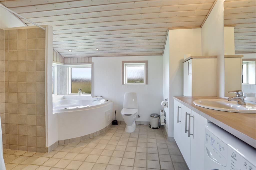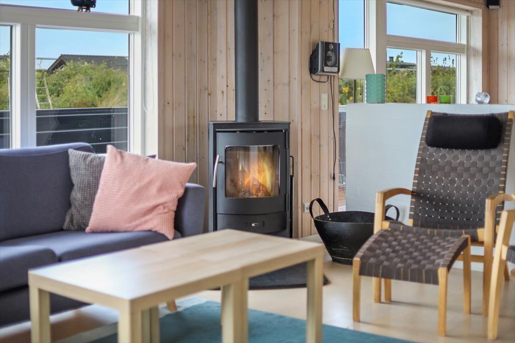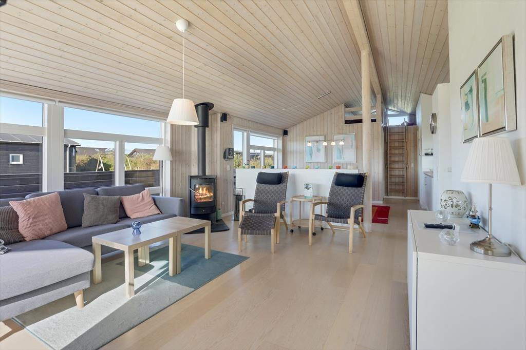 Indenfor mødes du af en lys og indbydende atmosfære, hvor der er tænkt på komfort og samvær. Husets hjerte er det åbne opholdsrum, hvor køkken, spiseplads og stue ligger i forlængelse af hinanden. Her kan du stå ved gryderne og stadig tage del i samtalerne rundt om bordet, mens børnene tegner eller spiller spil. Når dagen går på hæld, spreder brændeovnen sin knitrende varme, som gør det ekstra hyggeligt at samles i sofaen med en film eller en god bog. Sommerhuset har to badeværelser, og på det største finder du både indendørs spabad og sauna – perfekte rammer til en rolig stund, hvor kroppen kan forkæles efter en lang dag med Vesterhavsoplevelser.