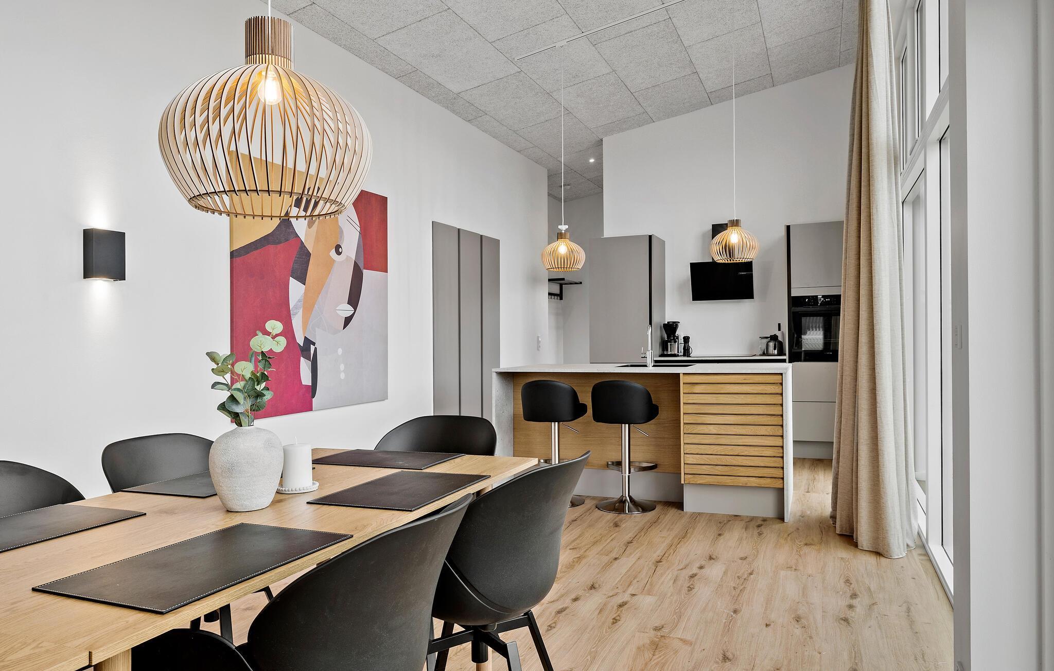 Dette rummelige sommerhus er placeret i Nr. Lyngby smukke natur, og her er forholdene ideelle til et ophold med flere familier eller en vennegruppe. Det åbne, moderne køkken lægger op til fælles madlavning, mens den lyse opholdsstue med store vinduesfronter sørger for en behagelig og hyggelig atmosfære. Læn jer tilbage i de komfortable sofaer og slut dagene af med brætspil og bøger..