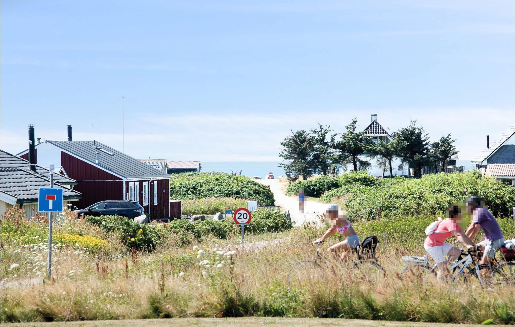 På en åben naturgrund med lille blik til vandet fra stue og terrasse, ligger dette arkitektonisk spændende og flotte feriehus. Huset er indrettet med entré og et soveværelse med adgang til eget badeværelse. Fra entréen er der adgang til det åbne, flotte køkken der ligger i tilknytning til spisepladsen. Her er desuden en hyggelig stue med pæn møblering samt loft til kip og store vinduespartier, der giver et flot lysindfald. Yderligere to soveværelser samt et badeværelse giver fint plads til seks personer. I hele huset er der trægulve undtagen på badeværelserne. På den store, afskærmede vestvendte terrasse, kan I nyde solen dagen lang, og ved husets indgang findes en god, mindre morgenterrasse. Feriehuset ligger centralt for ture til de dejlige turistbyer Løkken og Lønstrup.