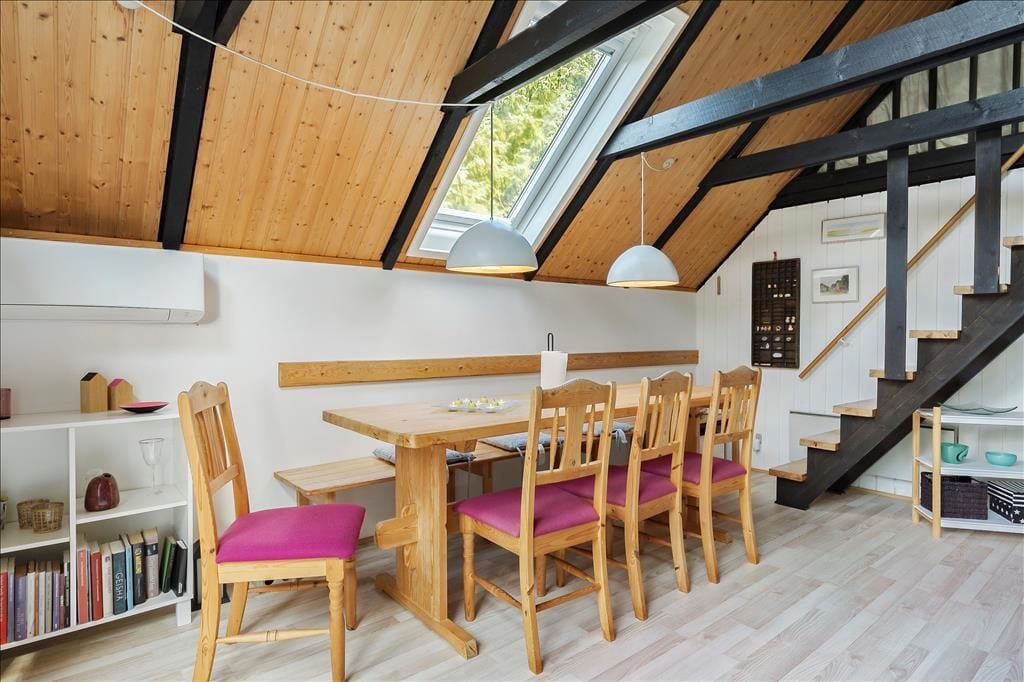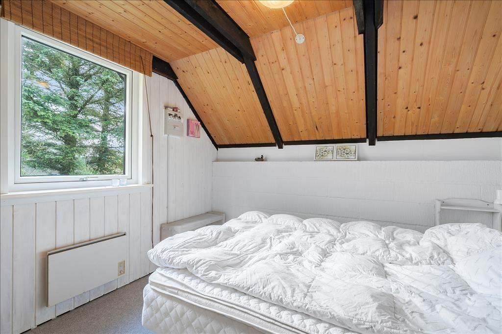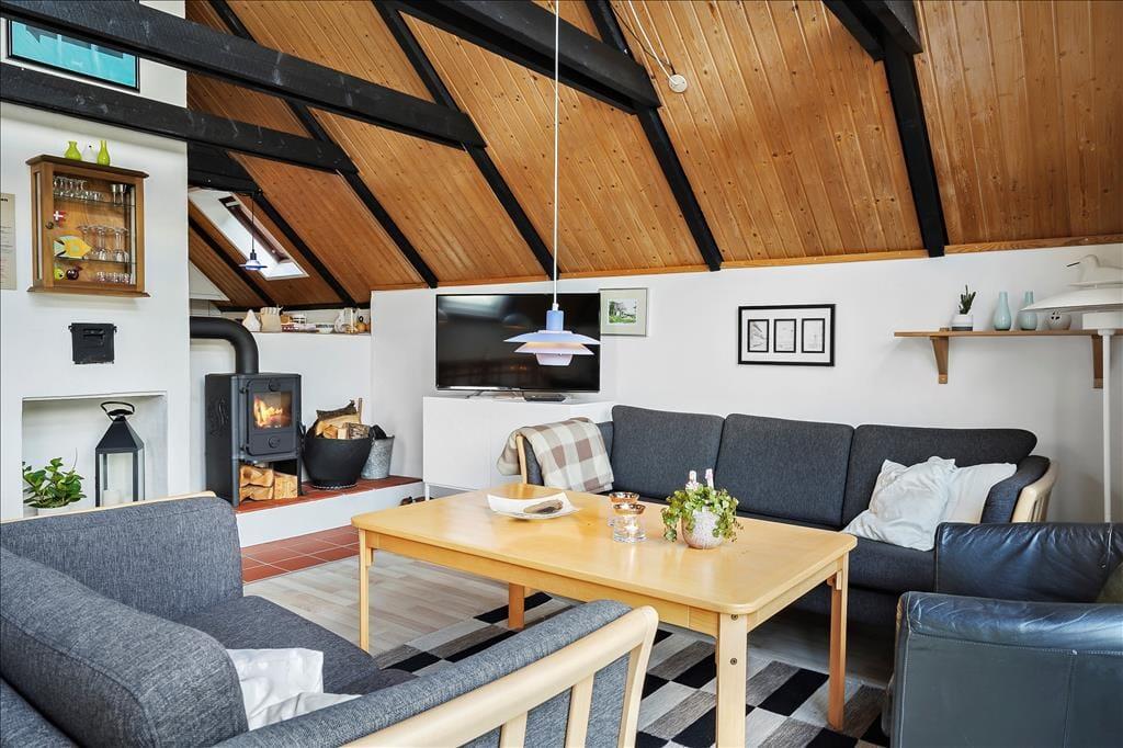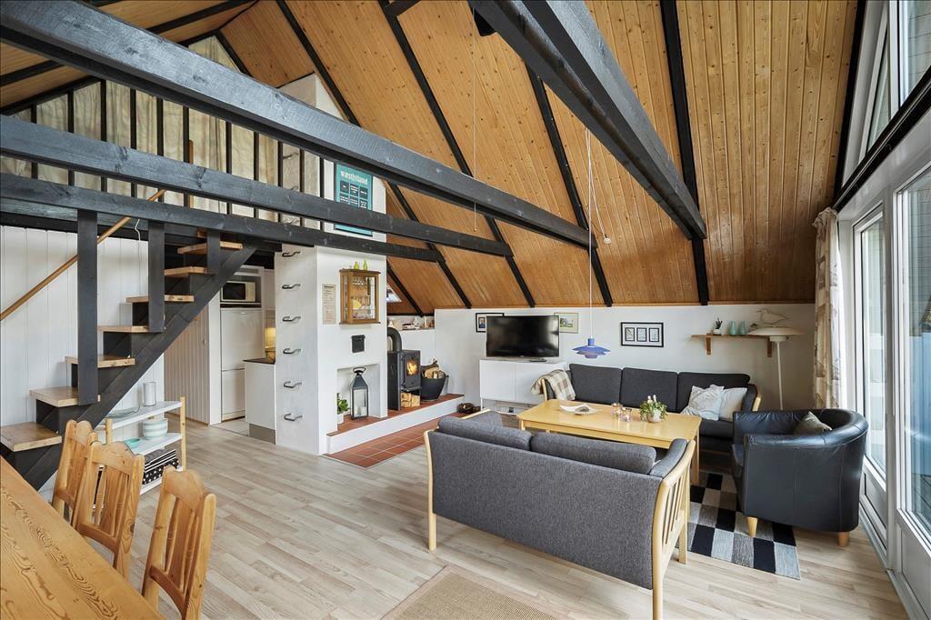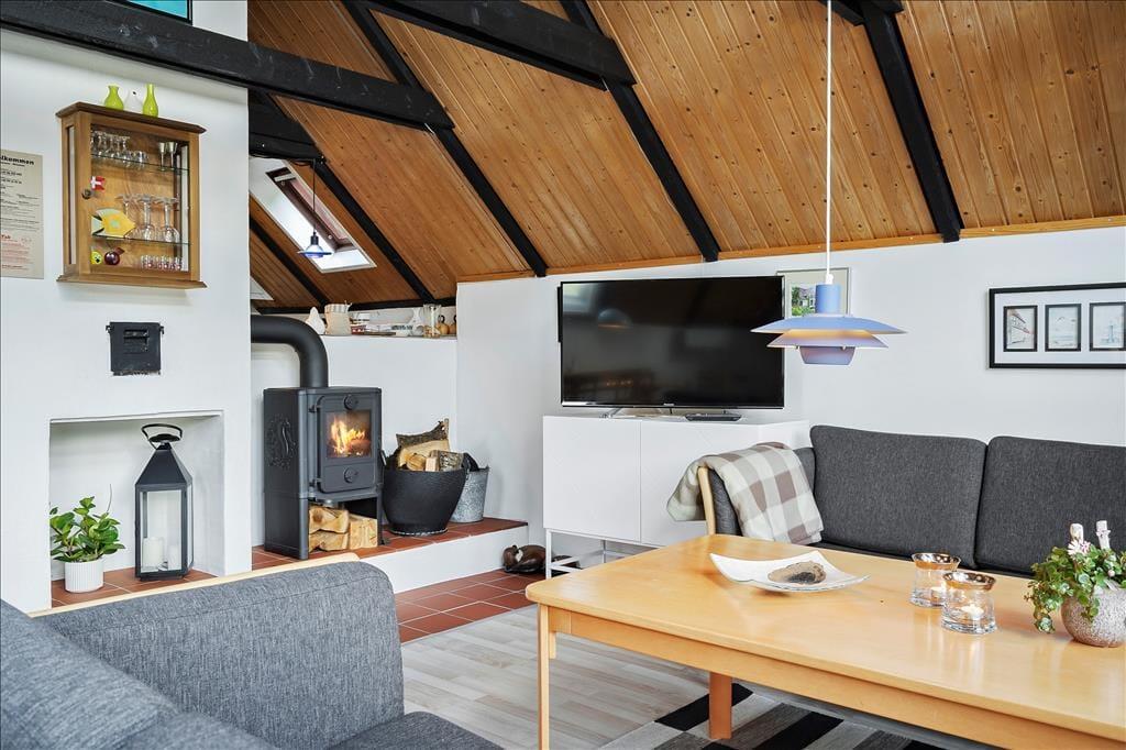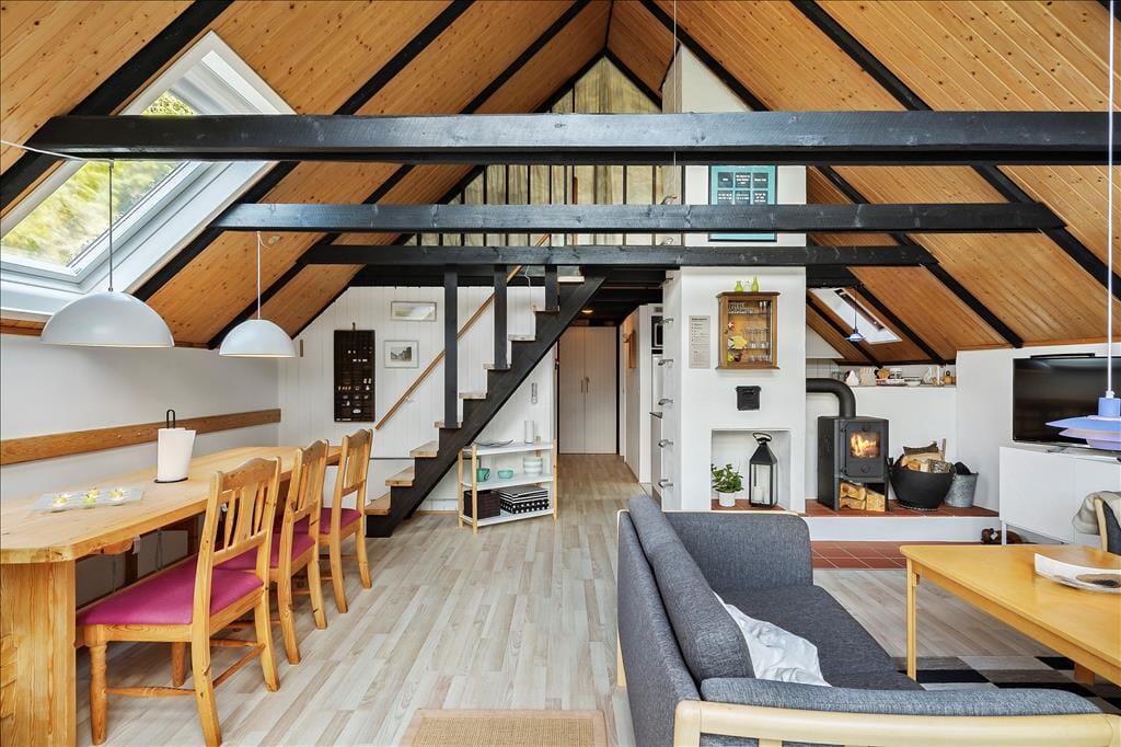 Det idylliske sommerhus er et såkaldt A-hus, hvor tagets stejle hældning får skråvæggene til at gå meget langt ned og skabe hyggelige kroge. Skråvæggene, de fritlagte spær og loftet helt til kip giver stuen en rar og ekstra hyggelig atmosfære, som især opleves på de mørke aftener, når ilden knitrer i brændeovnen. Her kan I krybe sammen i sofaerne og se en god film, hvis I da ikke bare vil fordybe jer i den seneste bog. Spisebordet er det ideelle sted at dyste i brætspil, og med åben adgang til det funktionelt indrettede køkken serveres dagens måltider let, mens opvaskemaskinen klarer rengøringen. Badeværelset byder på en bruseniche og en vaskemaskine, så I altid har friskt tøj klar selv på de lange ferier. Stueplanet rummer to gode soveværelser, og fra stuen fører en trappe op til en stor hems, der bringer antallet af sovepladser op på seks.