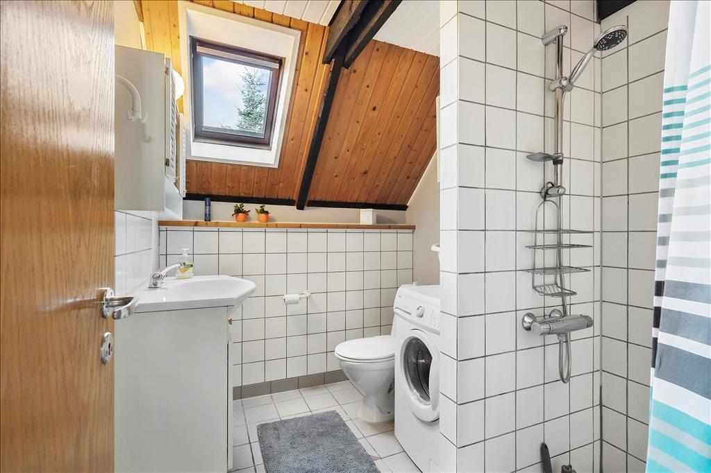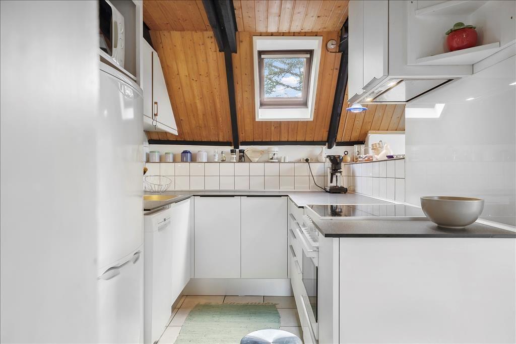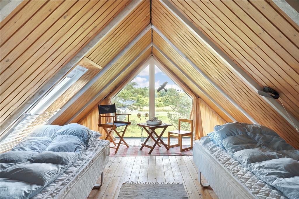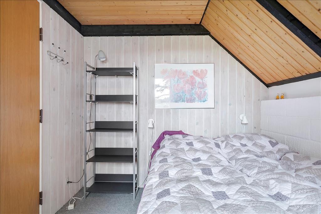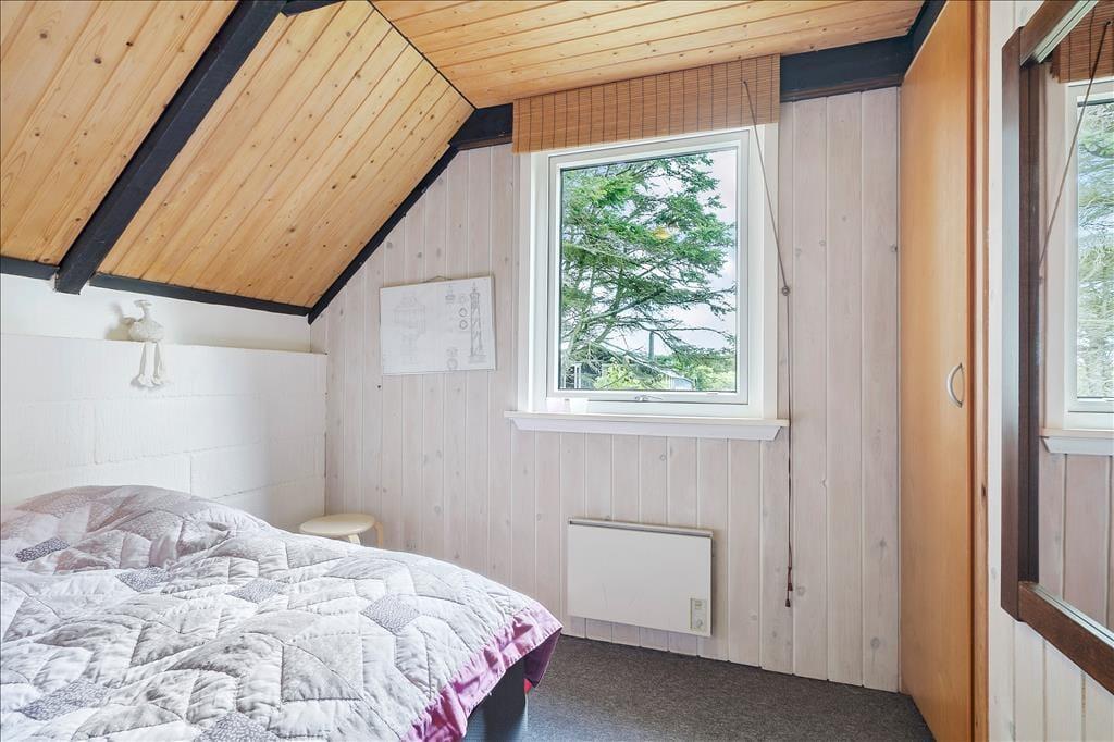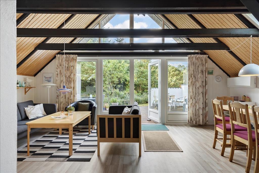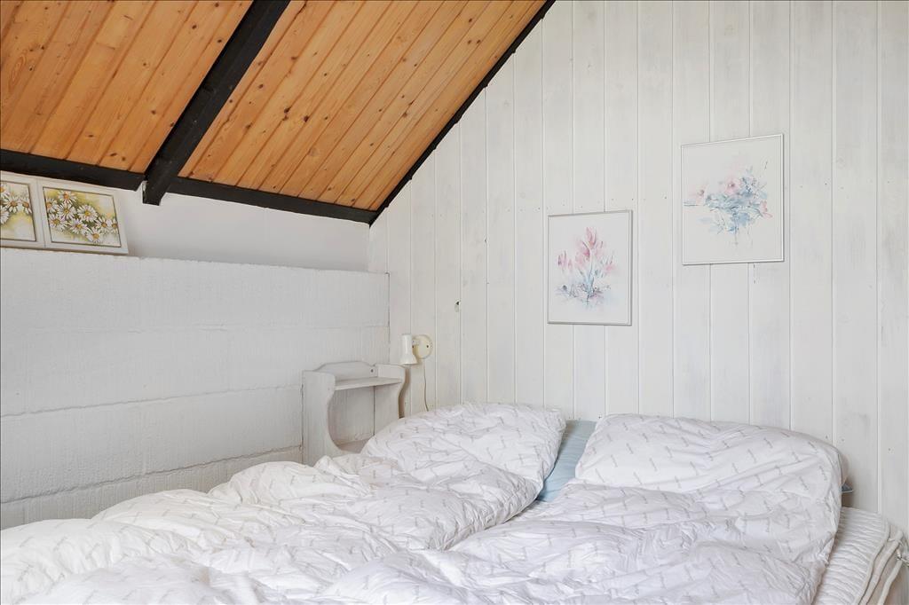 Det idylliske sommerhus er et såkaldt A-hus, hvor tagets stejle hældning får skråvæggene til at gå meget langt ned og skabe hyggelige kroge. Skråvæggene, de fritlagte spær og loftet helt til kip giver stuen en rar og ekstra hyggelig atmosfære, som især opleves på de mørke aftener, når ilden knitrer i brændeovnen. Her kan I krybe sammen i sofaerne og se en god film, hvis I da ikke bare vil fordybe jer i den seneste bog. Spisebordet er det ideelle sted at dyste i brætspil, og med åben adgang til det funktionelt indrettede køkken serveres dagens måltider let, mens opvaskemaskinen klarer rengøringen. Badeværelset byder på en bruseniche og en vaskemaskine, så I altid har friskt tøj klar selv på de lange ferier. Stueplanet rummer to gode soveværelser, og fra stuen fører en trappe op til en stor hems, der bringer antallet af sovepladser op på seks.