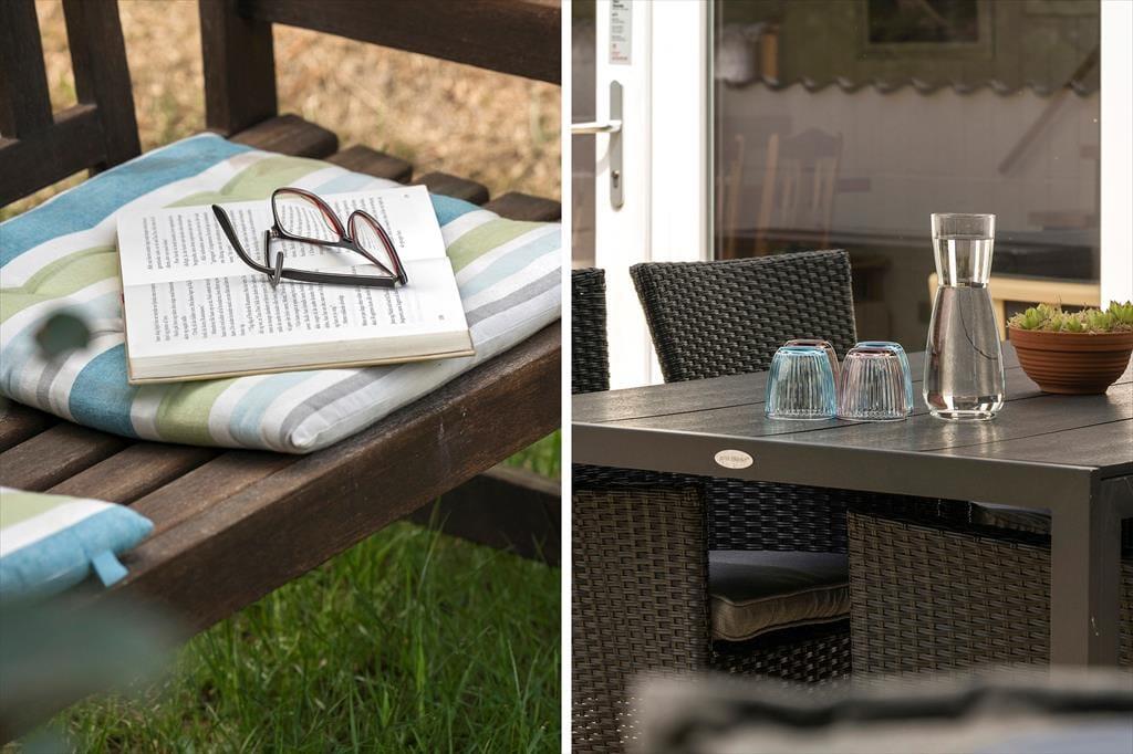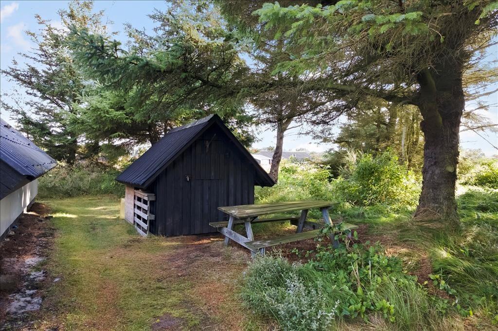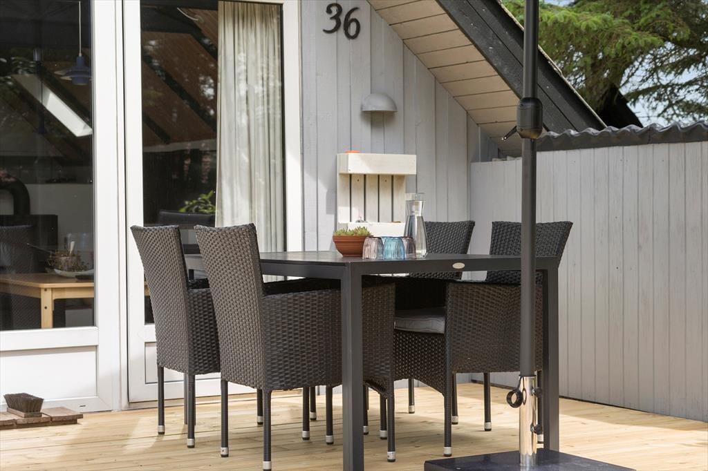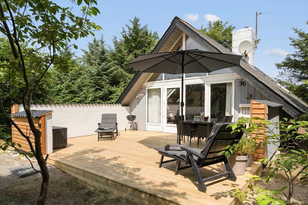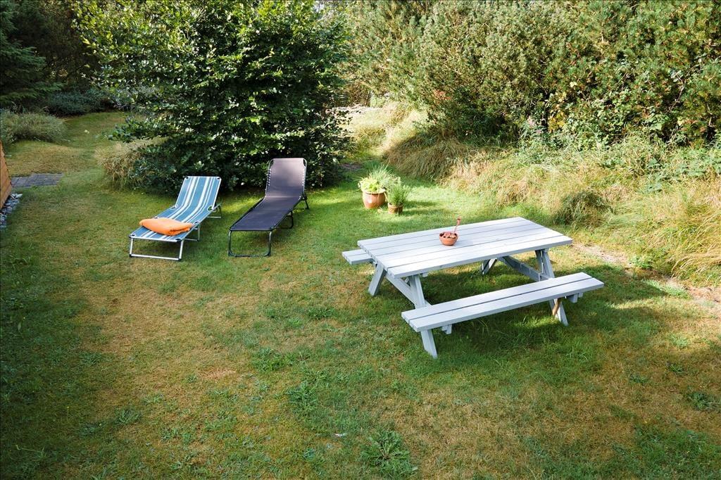 Hyggen er i top i sommerhuset, og det samme gælder for grunden, hvor træerne giver læ, og hvor sommerdagenes ro kun forstyrres af fuglenes sang. Fra stuen er der direkte adgang til en sydvendt terrasse, hvor I kan samles omkring terrassebordene til koldskål, friske jordbær med fløde, stegte rødspætter med nye kartofler og hvad sommerlandet ellers kan byde på. Haven byder på mange hyggelige kroge, hvor I kan slappe at helt uforstyrret i liggestolene og lade tankerne flyve.