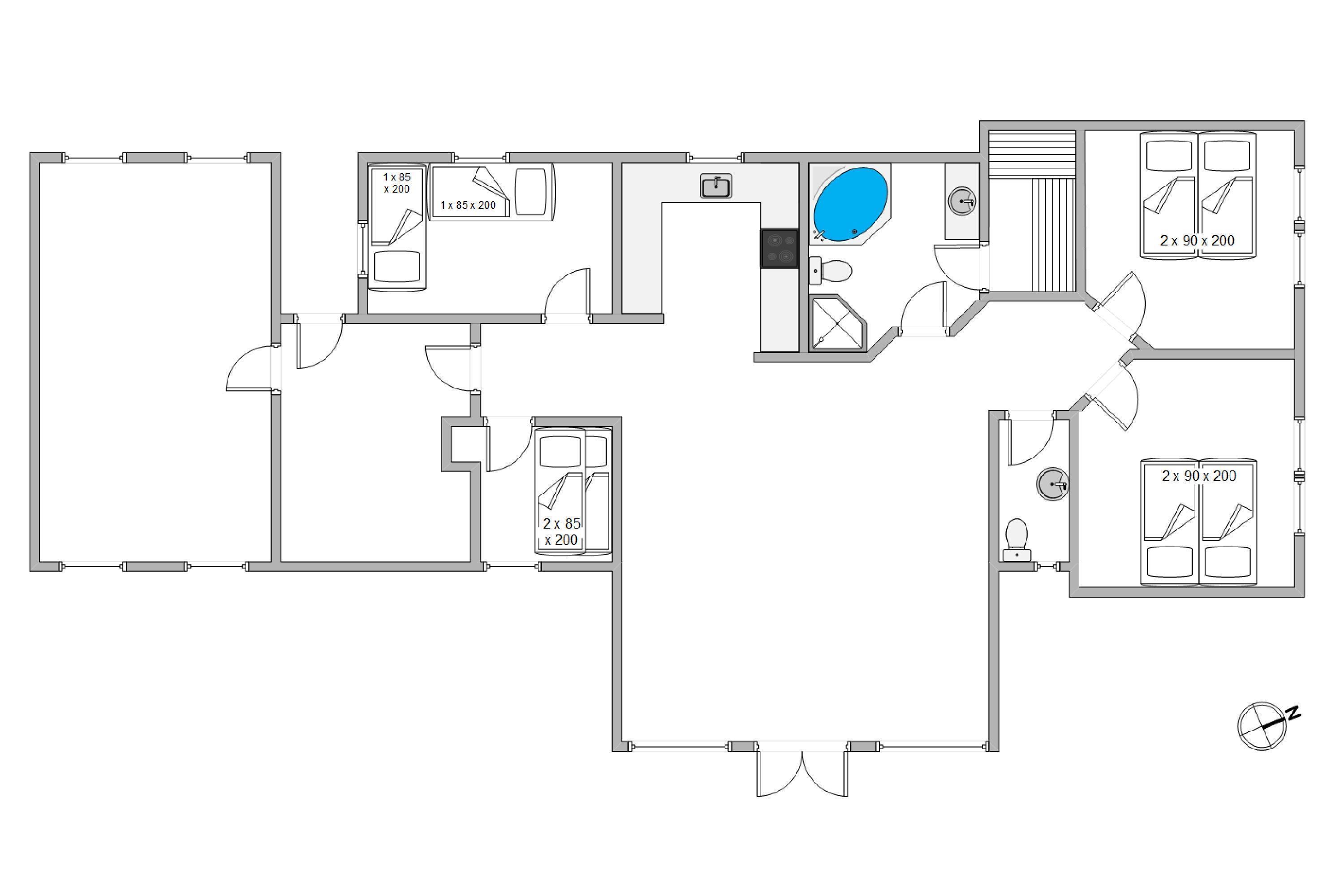 Derudover er der både et badeværelse og et gæstetoilet, så I undgår kø om morgenen. På badeværelset er der desuden både sauna og spabad, som medvirker til en ekstra afslappende ferie. I skal være opmærksomme på, at i februar 2026 bliver spabadet fjernet. Dernæst er der 4 soveværelser med henholdsvis 2 dobbeltsenge og 2 enkeltsenge samt 1 køjeseng, som sikrer jer en god nats søvn, så I er friske til feriens oplevelser.