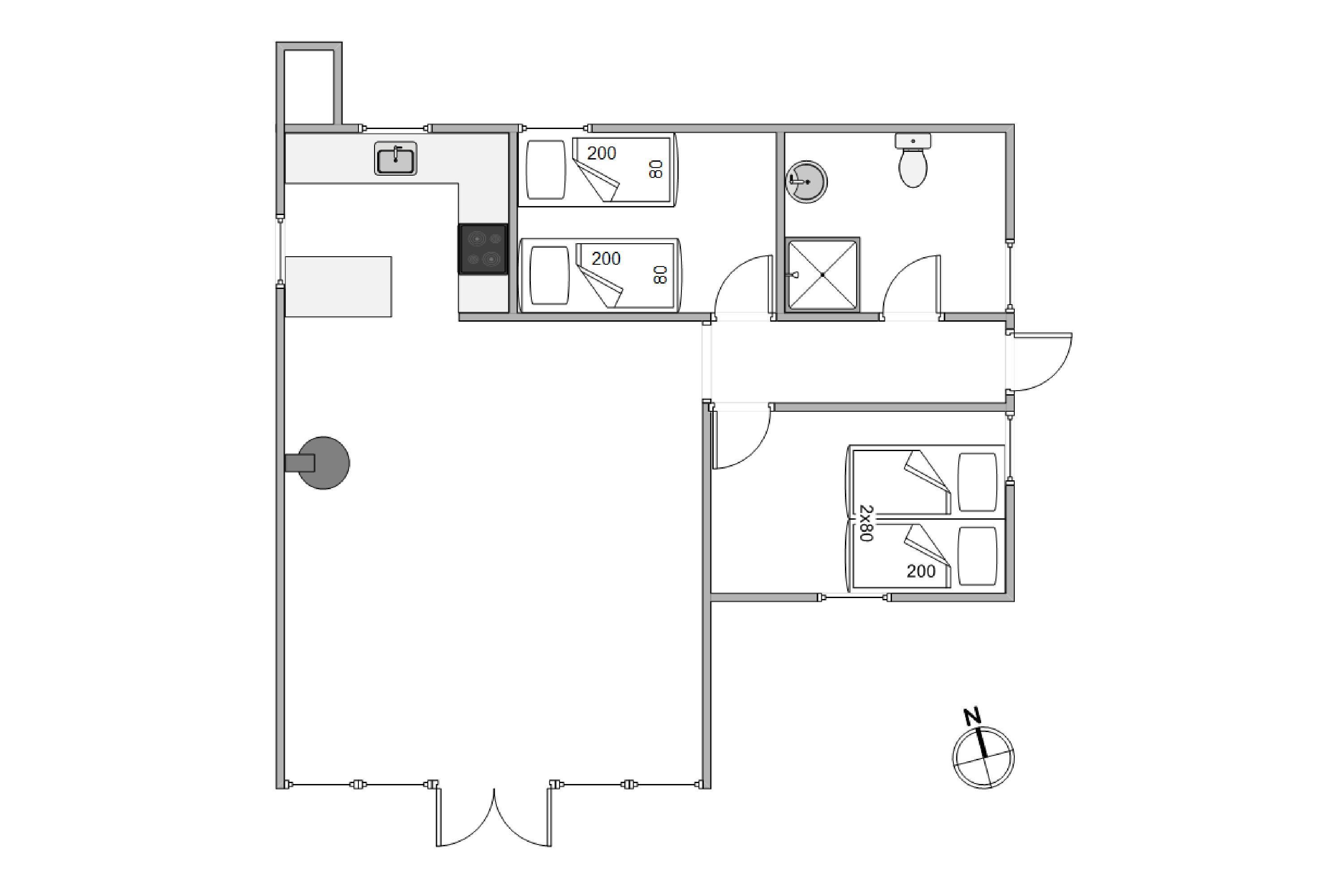 Hjertet i det 70 kvadratmeter store sommerhus på Fyrmarken 78 i Nr. Lyngvig er det hyggelige alrum. Her ligger køkkenet, stuen og spisepladsen i åben forbindelse, og derfor er rammen sat for gode stunder med madlavning, spil og film. Her er også Chromecast, så I kan streame jeres yndlingsfilm i tv’et.